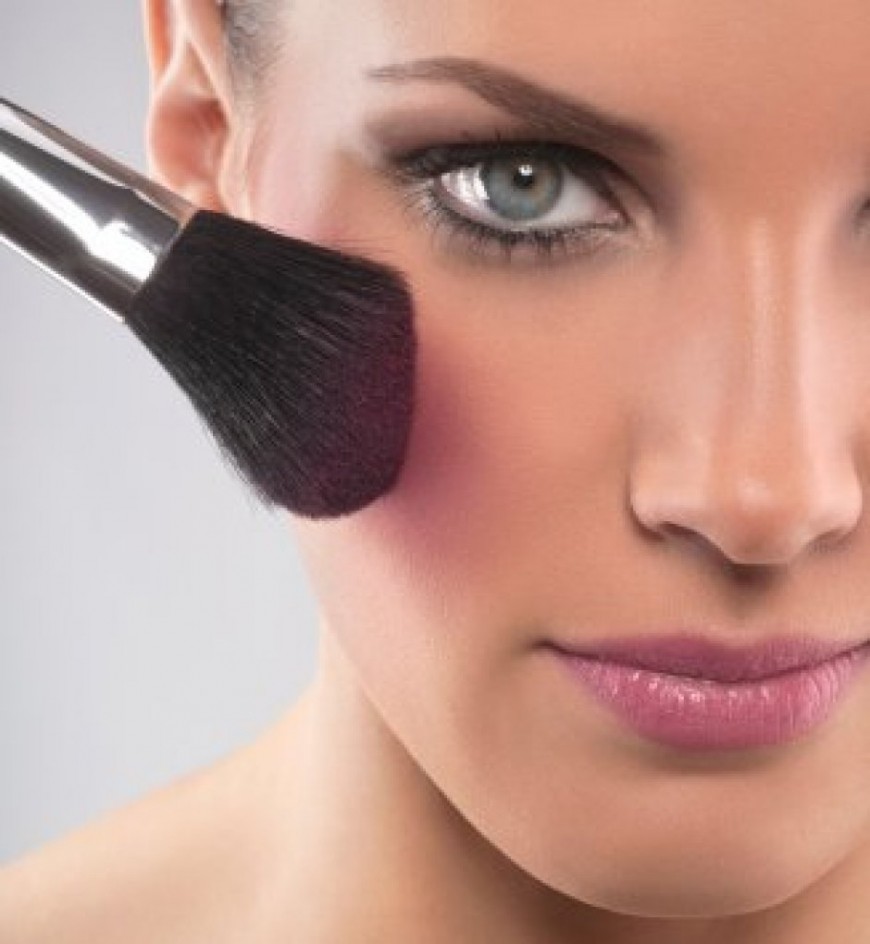 Karine, 32 ans, dentiste, en plus des produits de teint : un blush rose, des marron et taupe fondus pour la paupière, du mascara, un rouge à lèvres léger.