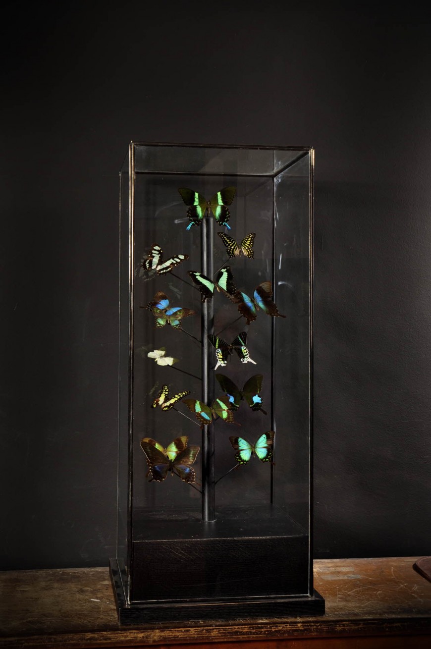 Corail, papillon et squelette de pélican sous globe[/caption]