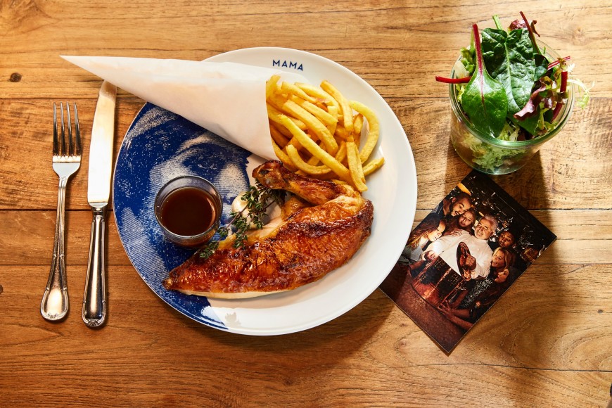 • Poulet rôti, frites, salade