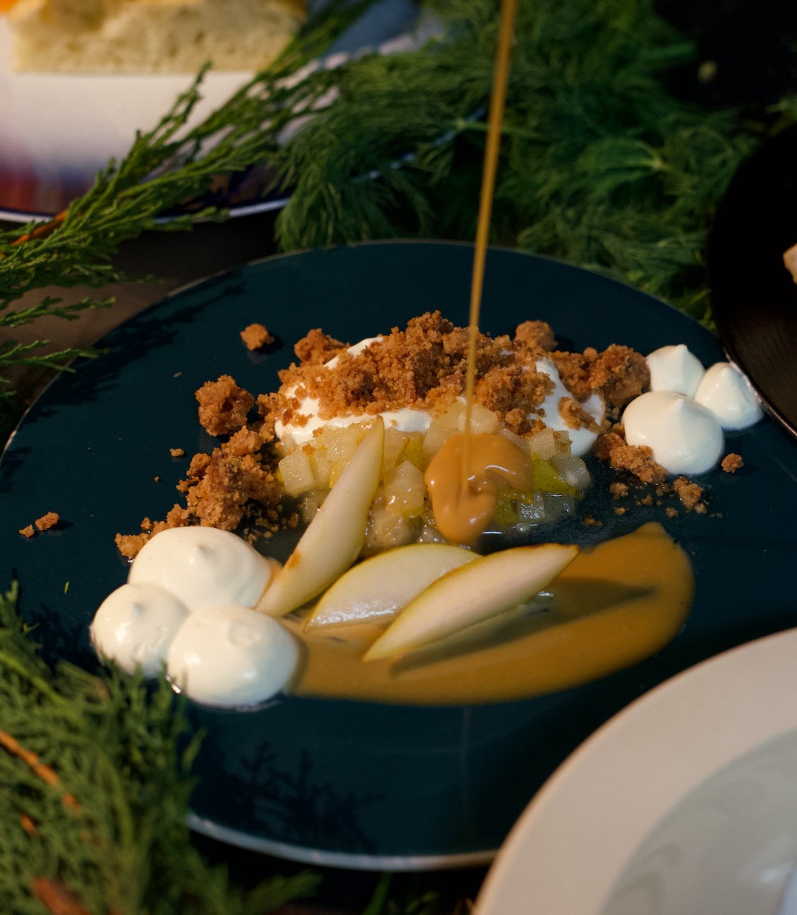 **Poire compotée, mousse au chocolat blanc & caramel beurre salé**
