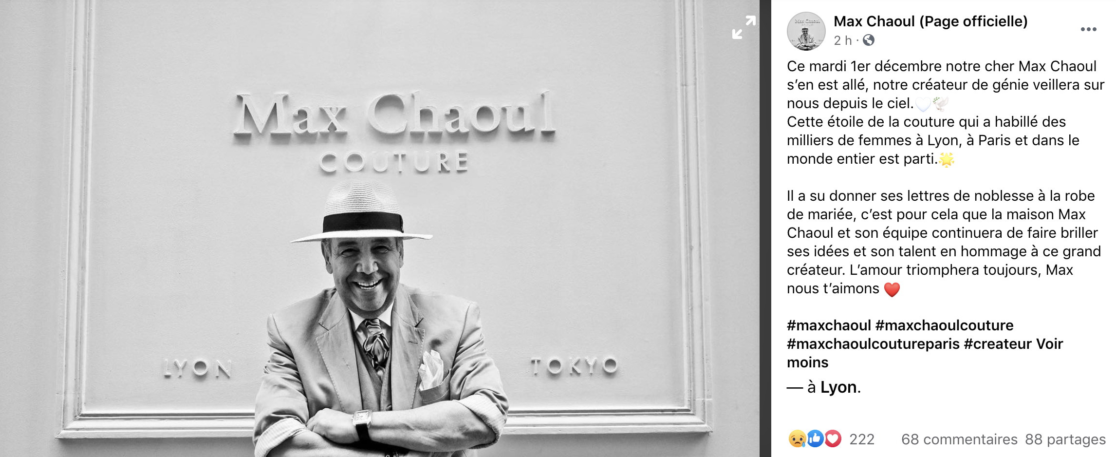 "Il a su donner ses lettres de noblesse à la robe de mariée, c’est pour cela que la maison Max Chaoul et son équipe continuera de faire briller ses idées et son talent en hommage à ce grand créateur. L’amour triomphera toujours, Max nous t’aimons."