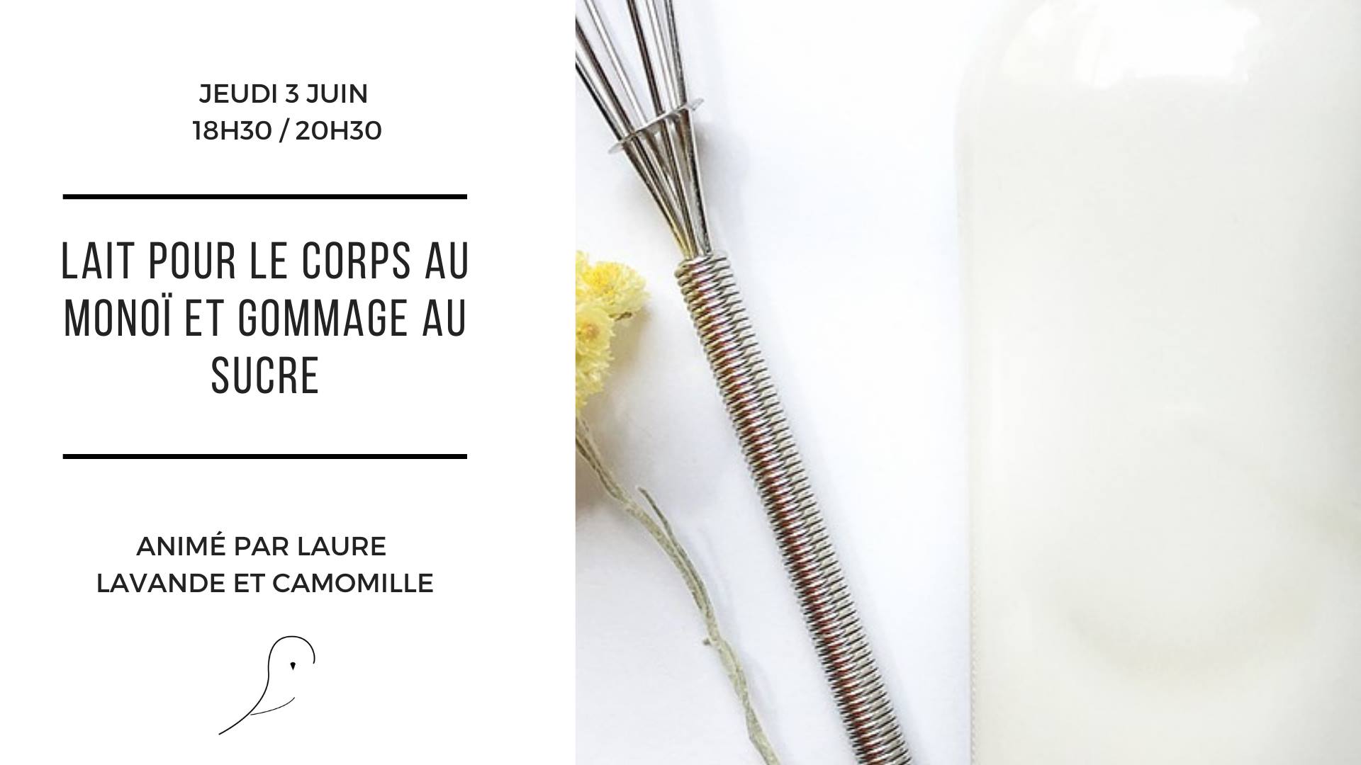 Venez participer à cet atelier DIY où vous serez guidées dans la fabrication de 2 soins cosmétiques faits-maison 100% naturels : un lait au monoï et un gommage au sucre. Ce workshop vous initiera pas à pas à la cosmétique naturelle et vous permettra de personnaliser vos 2 soins en fonction de votre type de peau et de vos envies.