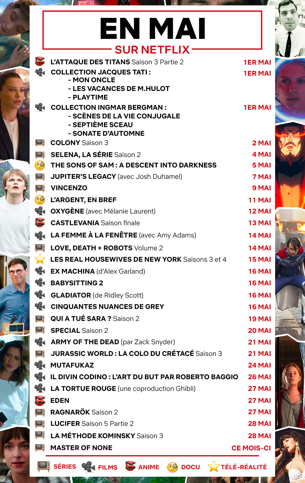 La célèbre plateforme de streaming a posté sur les réseaux sociaux son agenda des prochaines sorties en mai. Et le moins que l'on puisse dire, c'est que le catalogue Netflix va encore s'enrichir !