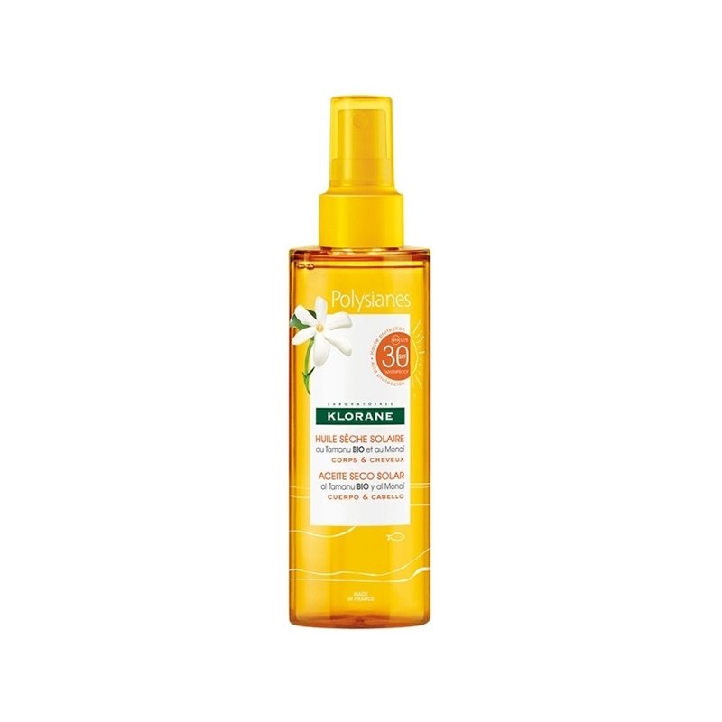 La Polysiane de Klorane : Une huile sèche à la protection SPF30 à la senteur de monoï, pour une peau protégée.