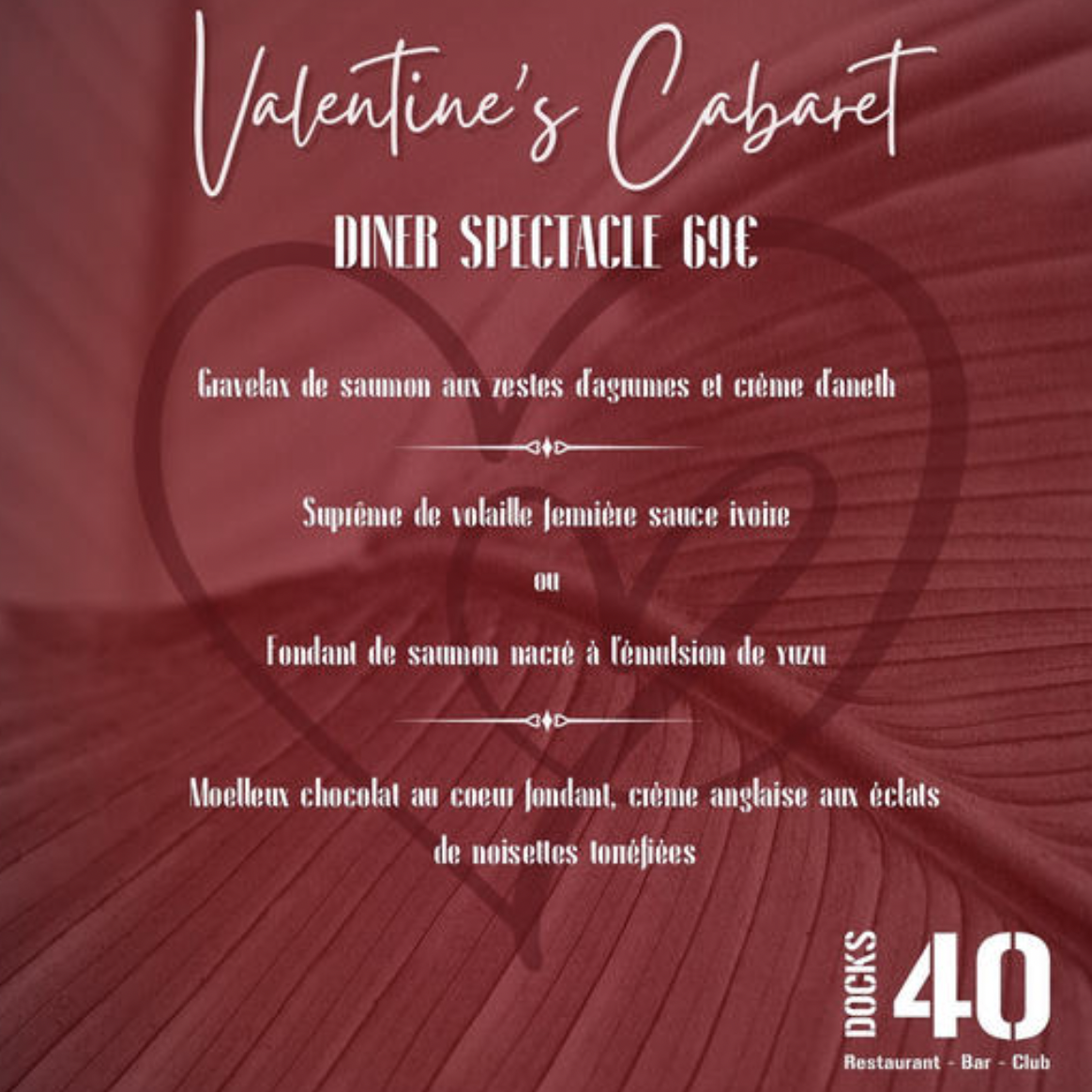 Rendez-vous dans le quartier de Confluence, où le Docks 40 vous a concocté une Saint-Valentin sous la forme d'un dîner-spectacle, le tout plongé dans une atmosphère intimiste ! Lors de cette soirée, vous profiterez d'un cabaret exceptionnel tout en dégustant un menu spécialement conçu pour l'occasion comprenant, un Gravelax de saumon eux zestes d'agrumes et crème d'aneth, suprême de volaille fermière sauce ivoire, fondant de saumon nacré à l'émulsion de yuzu et pour finir en beauté un moelleux chocolat au coeur fondant accompagné d'une crème anglaise aux éclats de noisettes torifiées.