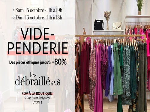 Les Débraillé.e.s sont déjà de retour pour leur rendez-vous mensuel. Toujours à découvrir : un vide-penderie avec des pièces éthiques ou de seconde main avec des réductions allant jusqu’à -80%. L’occasion parfaite pour renouveler sa garde-robe en ce début d’automne. Le rendez-vous est donné ce samedi de 11h à 19h et ce dimanche de 11h à 18h à la boutique des Débraillé.e.s au 5 rue Saint-Polycarpe dans le 1er arrondissement. Entrée libre et gratuite. Toutes les informations sur l’évènement ici