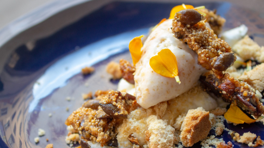 Le voyage continue avec le Sablé Mazapan aux cacahuètes grillés, nougatine de graine de courge, crème vanille et glace à cacahuète salé. Un dessert cuisiné comme un plat, plein de générosité.