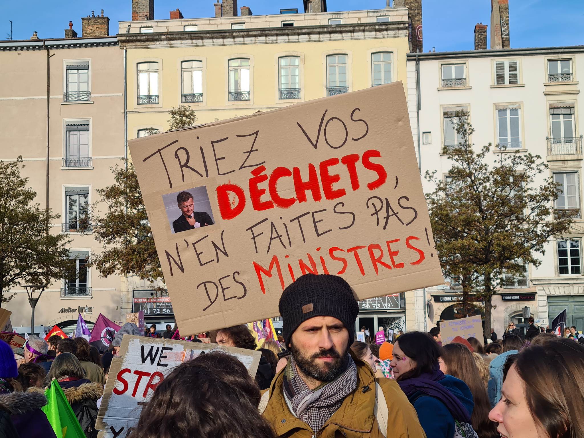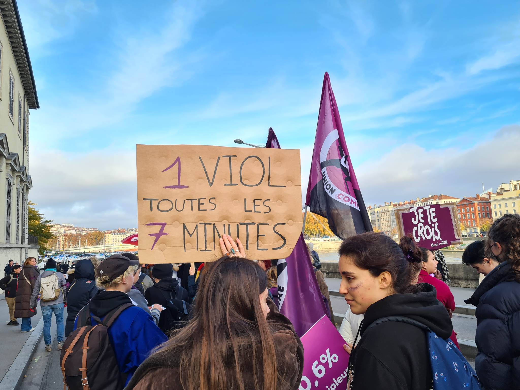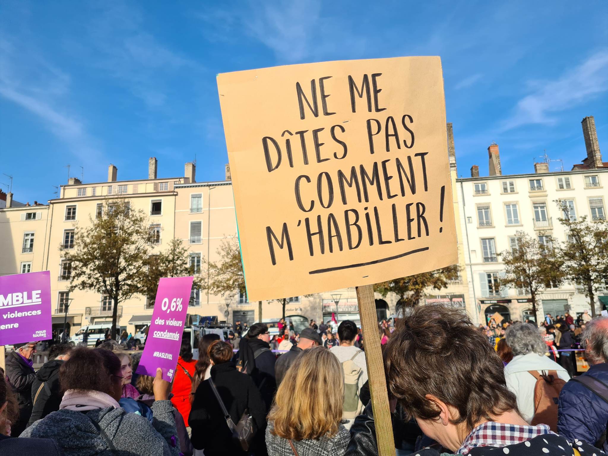 "L’amour ne fait pas de bleus", "Notre rage démolira votre impunité", "La seule chose que je ne peux pas faire comme un homme, c’est pisser debout contre un arbre… et encore !" étaient autant de pancartes brandies par les manifestants lyonnais.