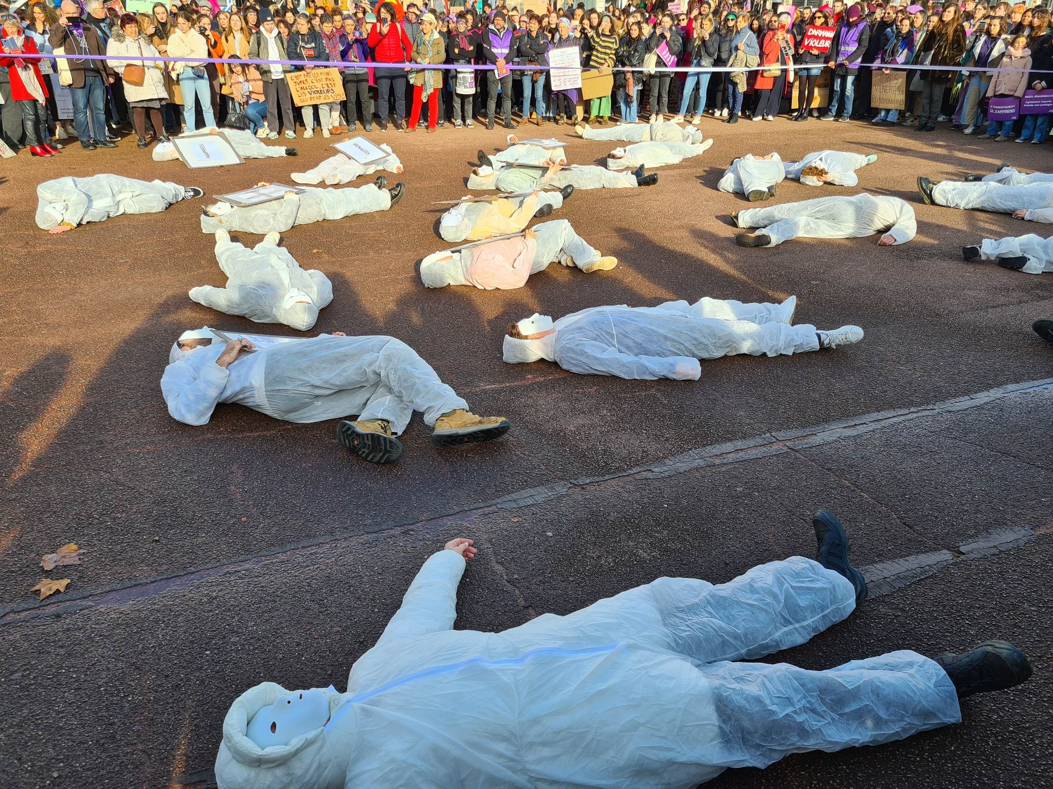 Là, un happening a eu lieu, avec des bénévoles de l’association Filactions vêtus de combinaisons et masques blancs qui se sont jetés au sol, pour dénoncer les violences subies par les femmes : "un message fort pour montrer à toutes les femmes qu’elles ne sont pas seules".