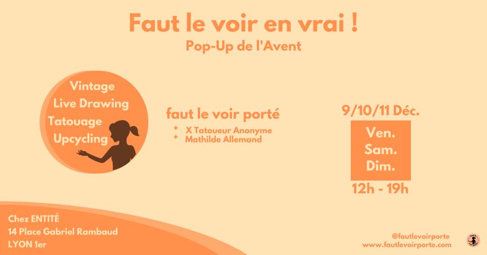 Une sélection vintage sur 3 jours d’une centaines de pièces chinées par le shop Faut le voir porté, des flash tattoo et un live painting par l’illustratrice Mathilde Allemand. L’apéritif d’inauguration a lieu le 9 décembre à partir de 18h avec cidre, vintage à gogo et dj set.