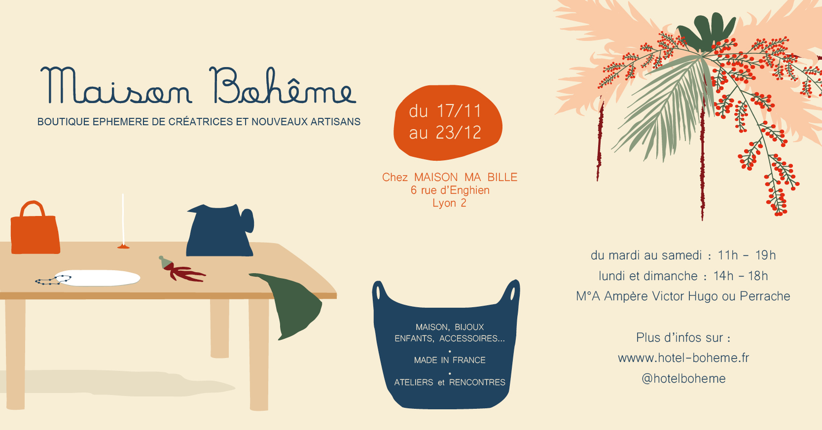 Une sélection soignée de créatrices et nouveaux artisans venus majoritairement de la région et de la France. Un concept hybride organisé par Hôtel Bohème : boutique, rencontres avec les créateurs, animations, soirées, dédicaces, ateliers DIY et bien d’autres surprises à découvrir.