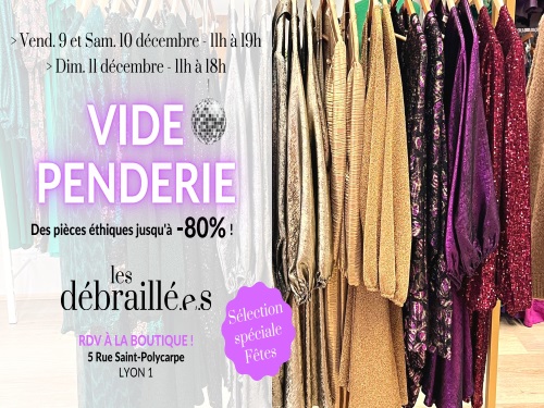 C’est avec une sélection spéciale fêtes de fin d’année que Les Débraillés organisent de nouveau leur vide penderie mensuel. Trois jours où des pépites éthiques seront à saisir avec des réductions allant jusqu’à -80%. Un corner seconde main avec des petits prix dès 2 euros sera également installé. Direction le 5 rue Saint-Polycarpe dans le 1er arrondissement : ce vendredi et ce samedi de 11h à 19h et ce dimanche de 11h à 18H. Entrée libre et gratuite. Plus d’informations ici