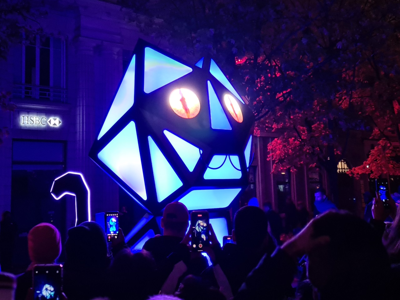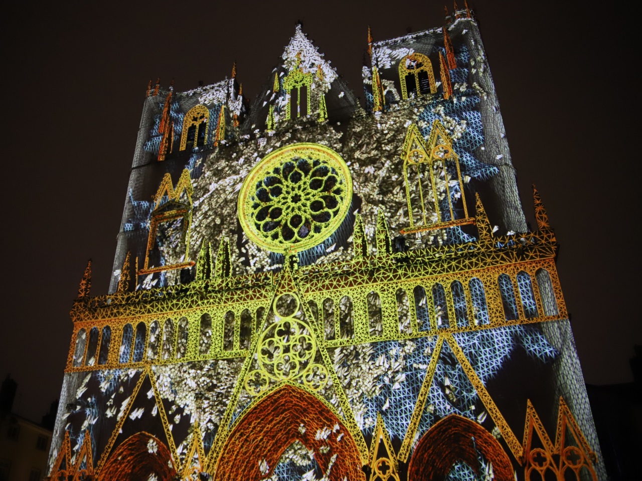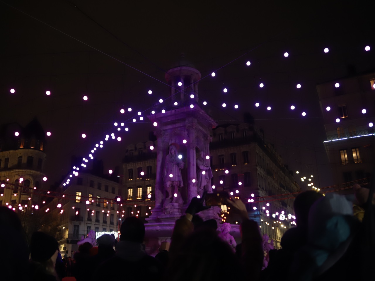Notre route se poursuit dans le Vieux Lyon avec la traditionnelle animation sur la façade de la cathédrale Saint-Jean. Pas de déception avec Time qui en fait voir de toutes les couleurs et de toutes les formes aux spectateurs. L’attente fut raisonnable pour accéder au site. Nous retournons ensuite sur les quais de Saône où les visiteurs sont de plus en plus nombreux. Difficile d’apercevoir depuis les quais Romain Rolland et Saint-Antoine "Le voyageur Céleste"… On passe notre tour pour ce soir afin de prendre la direction de la place des Jacobins. Là-aussi petite déception, on s’attendait à mieux même si les guirlandes lumineuses offrent une certaine poésie à la fontaine. A quelques centaines de mètres, Eikosis, le grand chat rieur de la place de la Bourse, attire les appareils photos par ses changements de couleurs mais sans aller plus loin.