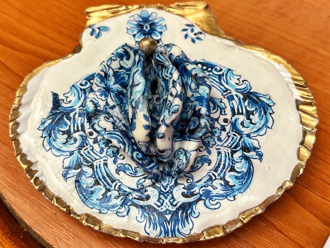 Marion travaille dans le secteur culturel à Lyon. Cette quadragénaire n’en dira pas plus sur son identité puisqu’elle entend rester anonyme derrière ses œuvres qui ne manquent pas d’originalité. Elle réalise des foufounes "uniques sans moule", plus exactement des vulves en argile puis peintes ou recouvertes d’un papier décoratif dans de la vaisselle ou encore des cadres chinés et dorés. "Ce qui m’intéresse beaucoup, c’est de détourner avec un sexe à l’intérieur des motifs ou des objets très classiques", explique Marion pour qui l’aventure Foufounart a débuté en avril 2021. "J’ai collé dans un square de la Croix-Rousse des œuvres de foufounes. Pendant le deuxième confinement, j’ai eu envie de tenter de m’exprimer dans la rue", se rappelle-t-elle. "Je n’ai pas de formation académique en art. Je suis vraiment autodidacte", précise-t-elle.