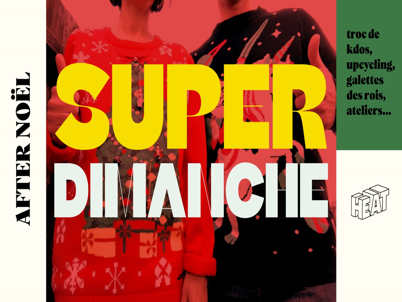 Direction ce dimanche HEAT, la halle à manger du quartier de Confluence pour l’évènement "Super dimanche". Au programme de cette nouvelle édition : un after Noël où il sera possible de participer à un grand troc de cadeaux sans oublier de manger une part de galette des rois. Rendez-vous de 12h à 22h au 70 quai Perrache dans le 2e arrondissement. Plus d’informations ici