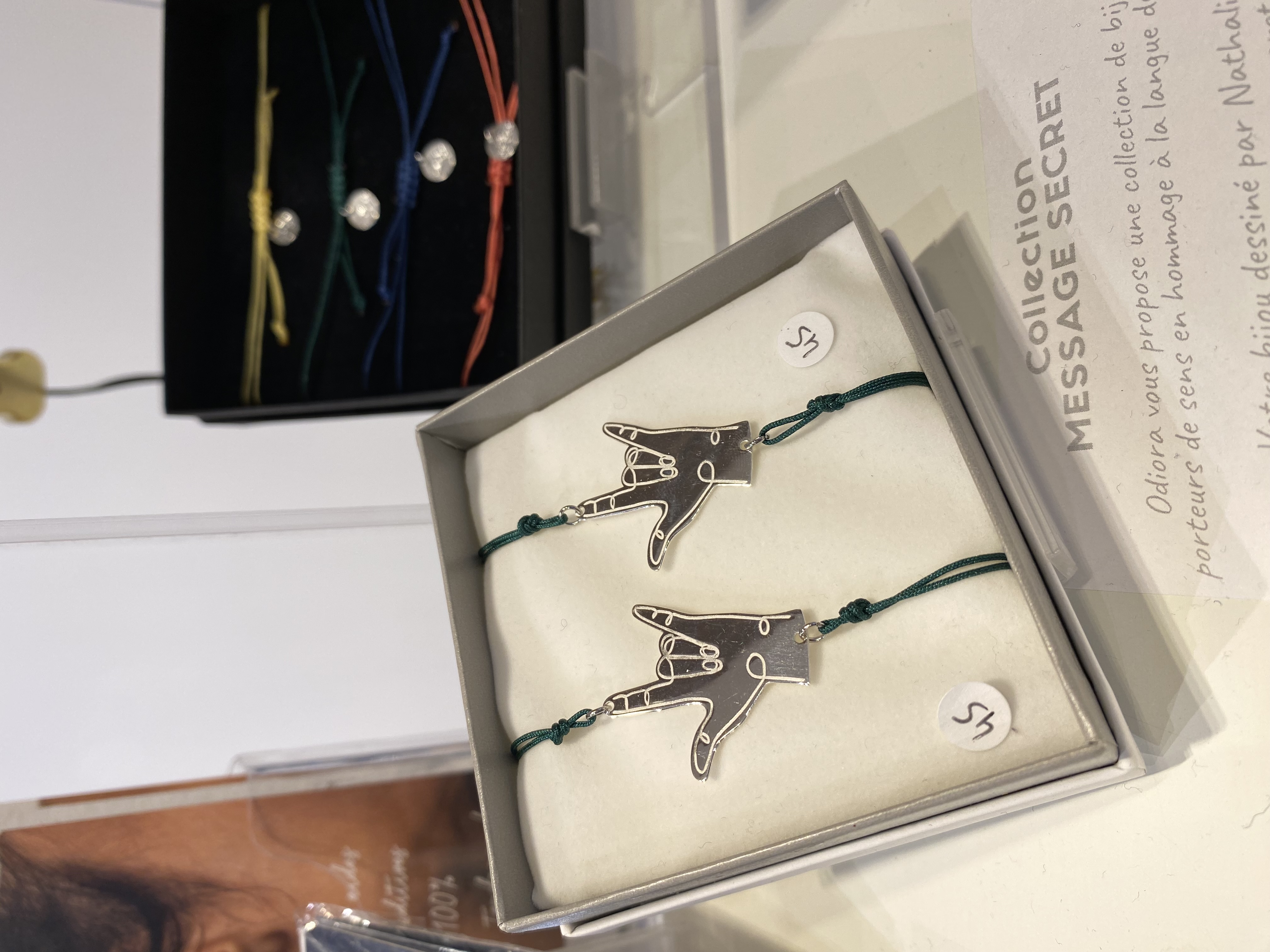 Notre coup de cœur ? La collection Message Secret. Il s’agit de bijoux en argent 925 et pierres fines, inspirés de la Langue des Signes. Deux signes sont à découvrir, Je t’aime, et le signe de la solidarité, du lien, de l’amitié. "J’essaie de créer du lien entre le monde des sourds et le monde des entendants" souligne Nathalie.