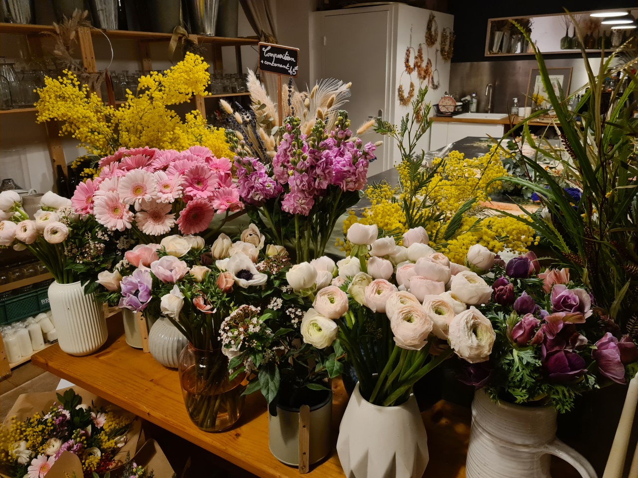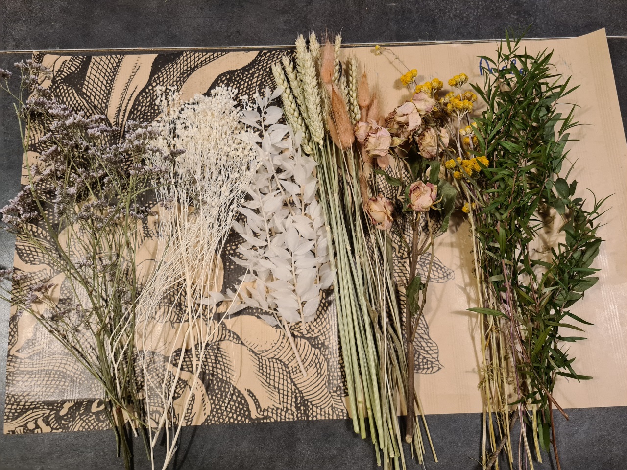 Le jour J, direction la boutique de Brontie installée dans une petite impasse. A peine la porte franchie, l’odeur du mimosa me chatouille délicieusement le nez. Le lieu est cosy et coloré. Ce sont Juliette et Valentine qui m’accueillent et qui seront en charge de l’atelier. Les deux jeunes femmes proposent un peu de thé pour se réchauffer et des bugnes pour la gourmandise (on en profite c’est la saison). Nous serons quatre participantes en ce début de soirée. Tout est déjà prêt sur la grande table : différentes fleurs séchées sont disponibles sous nos yeux sélectionnées selon nos demandes. Je découvre des teintes douces qui ne donnent qu’une envie : commencer ! Juliette et Valentine m’indiquent les différentes variétés : lagurus, limonium, avoine, broom et même des roses françaises… Car oui la maison dont la création remonte à 2018 s’engage uniquement auprès des producteurs du pays. Les déchets verts sont également compostés et les emballages recyclés.