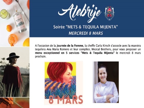 Avis aux gourmandes et aux gourmands ! La cheffe Carla Kirsch s’associe avec la maestra tequilera Ana Maria et leur complice, Mezcal Brothers, pour proposer à l’occasion de la journée de la Femme un menu exceptionnel en 5 services "Mets & Tequila Mijenta". A déguster : foie gras, sole ou encore barbacoa d’agneau de lait… 120 euros par personne (accords compris). Toutes les informations ici