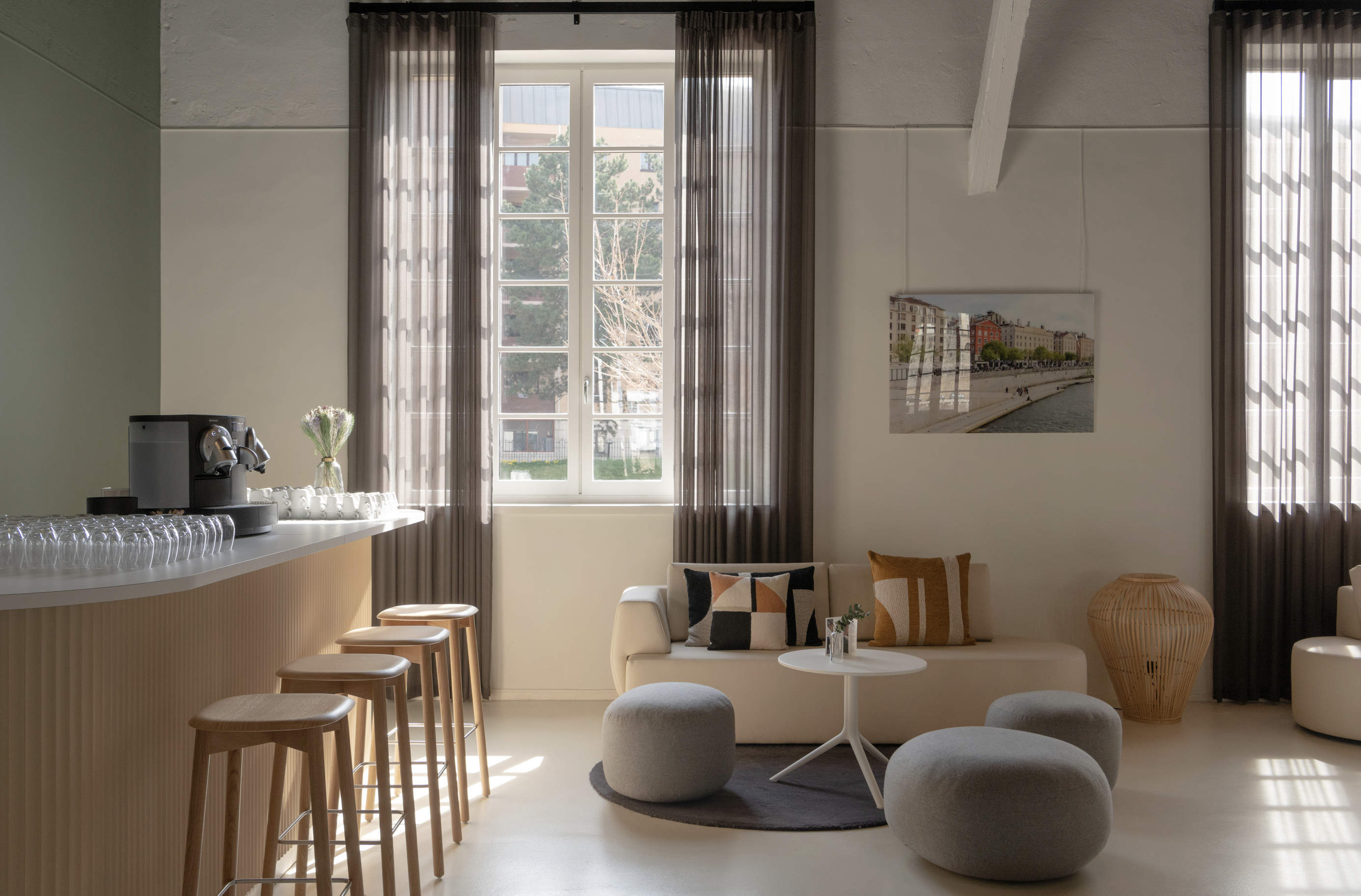 Pour moi, c’est un lieu incontournable à Lyon, destiné aux événements professionnels : conventions, salons, conférences… Avec l’Embarcadère, c’est une histoire de longue date, nous nous connaissons plutôt bien. Nous avons travaillé pour eux en 2019, où nous avons commencé à monter un petit peu en gamme en travaillant la signalétique et les éléments de décors intérieurs. Un premier travail assez léger, mais qui a porté ses fruits puisque c’est tout naturellement qu’ils sont revenus nous chercher pour la suite et c'est dès lors que nous avons entamé la plus grosse rénovation du lieu. Nous avons travaillé autant sur la charte graphique, l'identité visuelle que sur la rénovation intérieure jusqu'au design de certains éléments du mobilier.