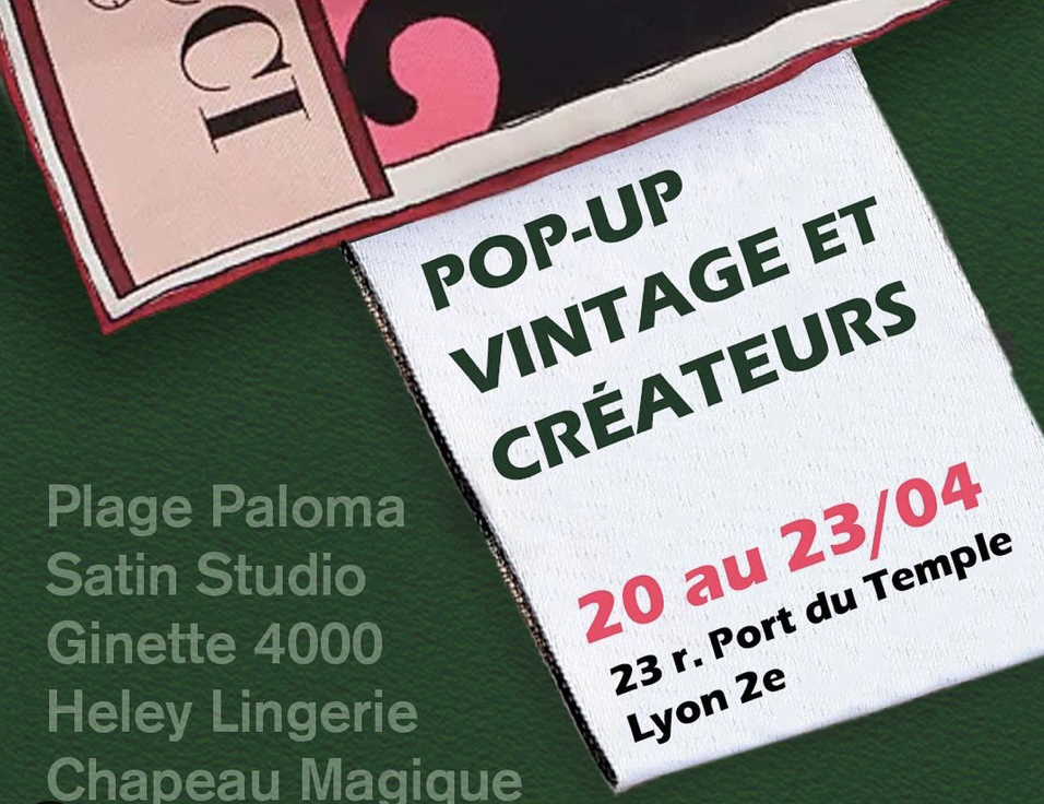 Ce week-end se tiendra un nouveau pop up de vintage et de créateurs dans le 2e arrondissement. Une sélection de vêtements d’archives et de designer par la friperie Ginette 4000 : YSL, Courrèges, Levis, Kenzo… La friperie lyonnaise Plage Paloma présentera des pièces vintage pour hommes. Mais aussi, des bijoux vintage haut de gamme par le Chapeau Magique, des vêtements en soie fabriqués à Lyon par Satin Studio et de la lingerie eco responsable made in France par Heley Lingerie. Rendez-vous de 20 au 23 avril au 23 rue Port du Temple. Plus d'infos ici.