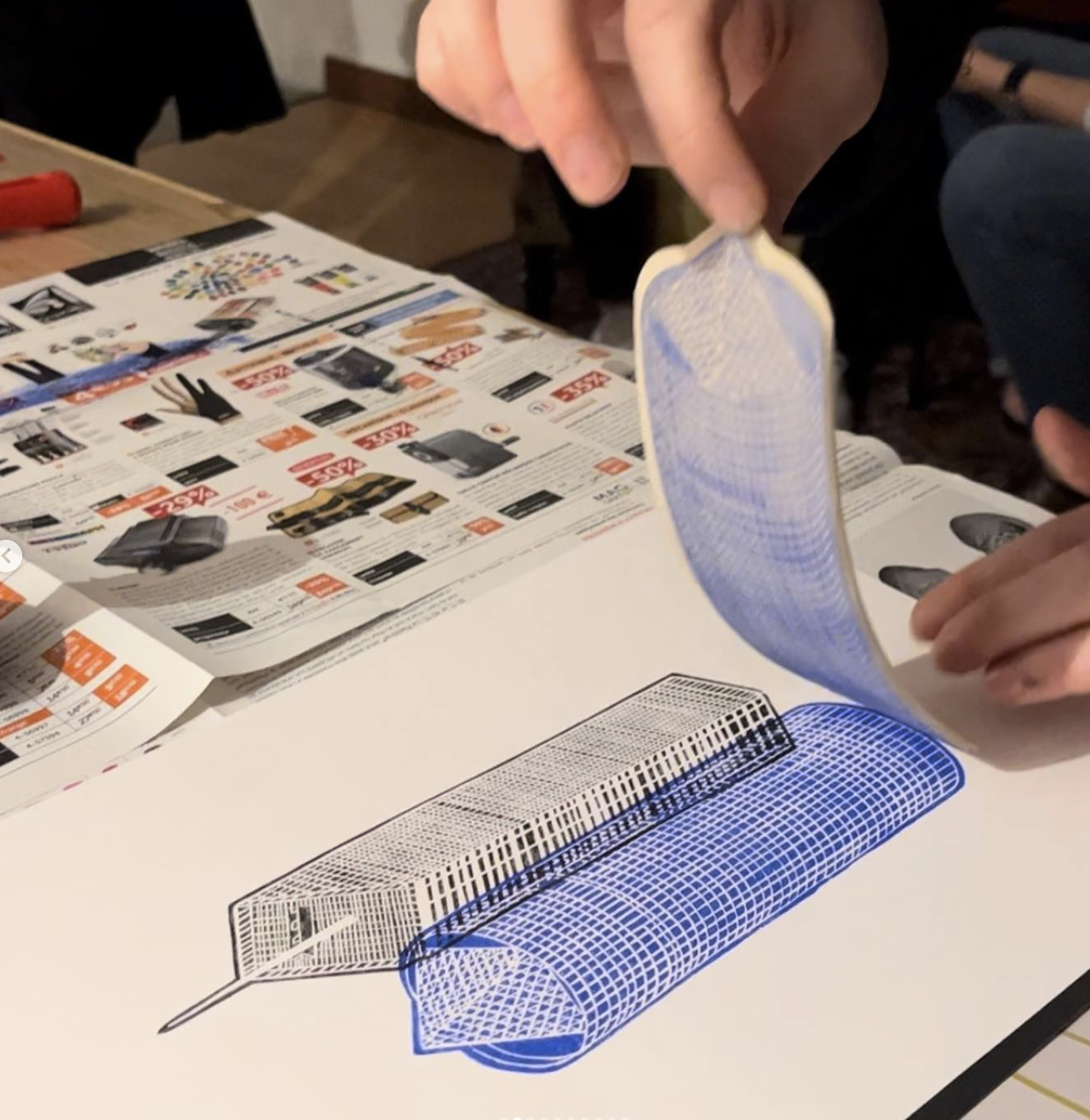 Depuis le début de l’année, je fais partie des membres occupants de l’ÉPI, Espace de Partage et d’Innovation, au sein du Laboratoire Extérieur des Gratte-Ciel, à Villeurbanne. Certains samedis après-midi et sur réservation, j’y anime durant trois heures des ateliers d’initiation à la linogravure, ouverts à cinq personnes. J’y présente évidemment la technique, les étapes, les outils ainsi que des exemples de réalisations, et j’accompagne ensuite les participant.es à transformer l’un de leur dessin en matrice gravée puis en linogravures.
