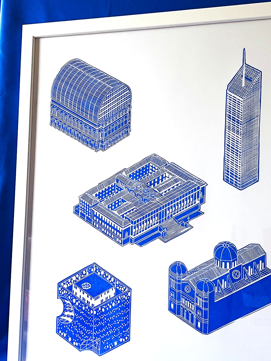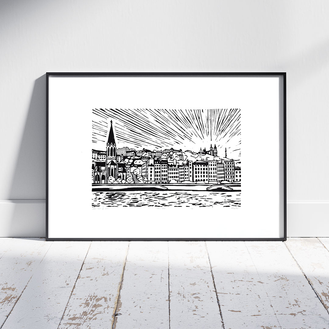 Je m’inspire de l’architecture et des paysages urbains dont je croise le chemin pour réaliser mes gravures, j’aime partir du réel. Par déformation professionnelle, j’aime me questionner sur la manière dont sont construits les bâtiments et les espaces qui nous entourent ; observer et retranscrire sur papier les lignes, les proportions, les textures, les rythmes. C’est un exercice auquel je me suis notamment prêtée en novembre 2022 en dessinant, gravant et imprimant chaque jour un nouveau bâtiment de Lyon pour ma série Repères Lyonnais. Il faut le dire, cette ville ne cessera de m’inspirer. Je me nourris au quotidien de références culturelles, il y en a sur mes murs, dans mes oreilles et ma bibliothèque, j’en ai besoin pour découvrir et comprendre des parcours, des positionnements, des styles… Je suis autant captivée par les estampes japonaises que par les performances de Marina Abramović, par l’art poignant de Frida Kahlo que par les empaquetages de Christo et Jeanne-Claude.