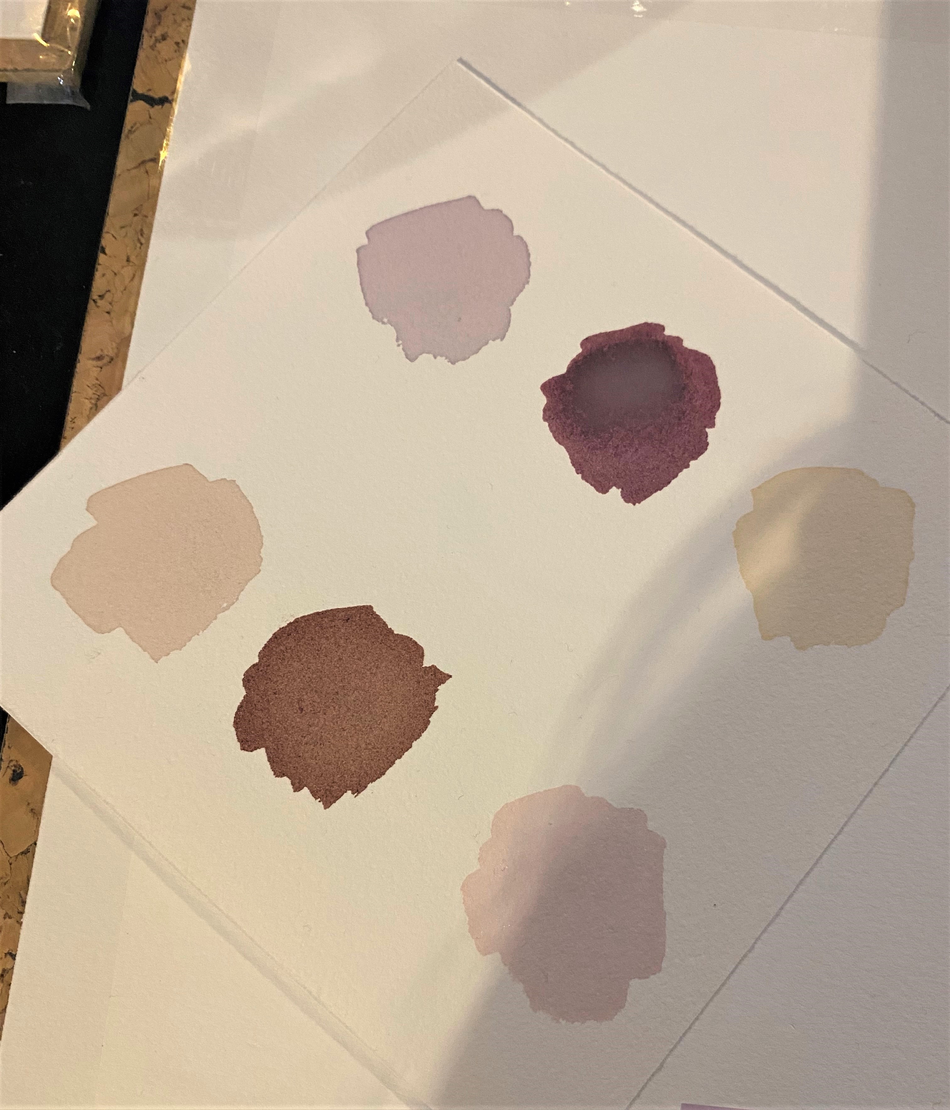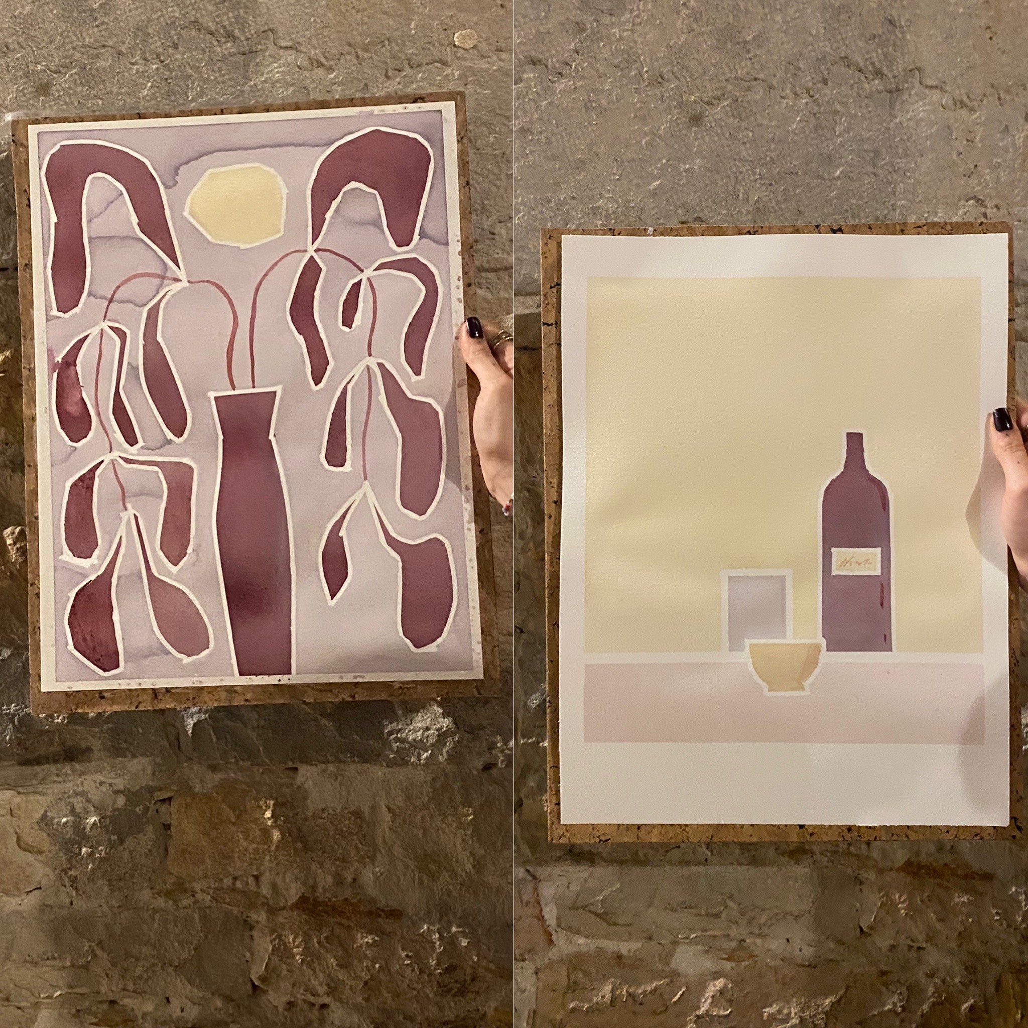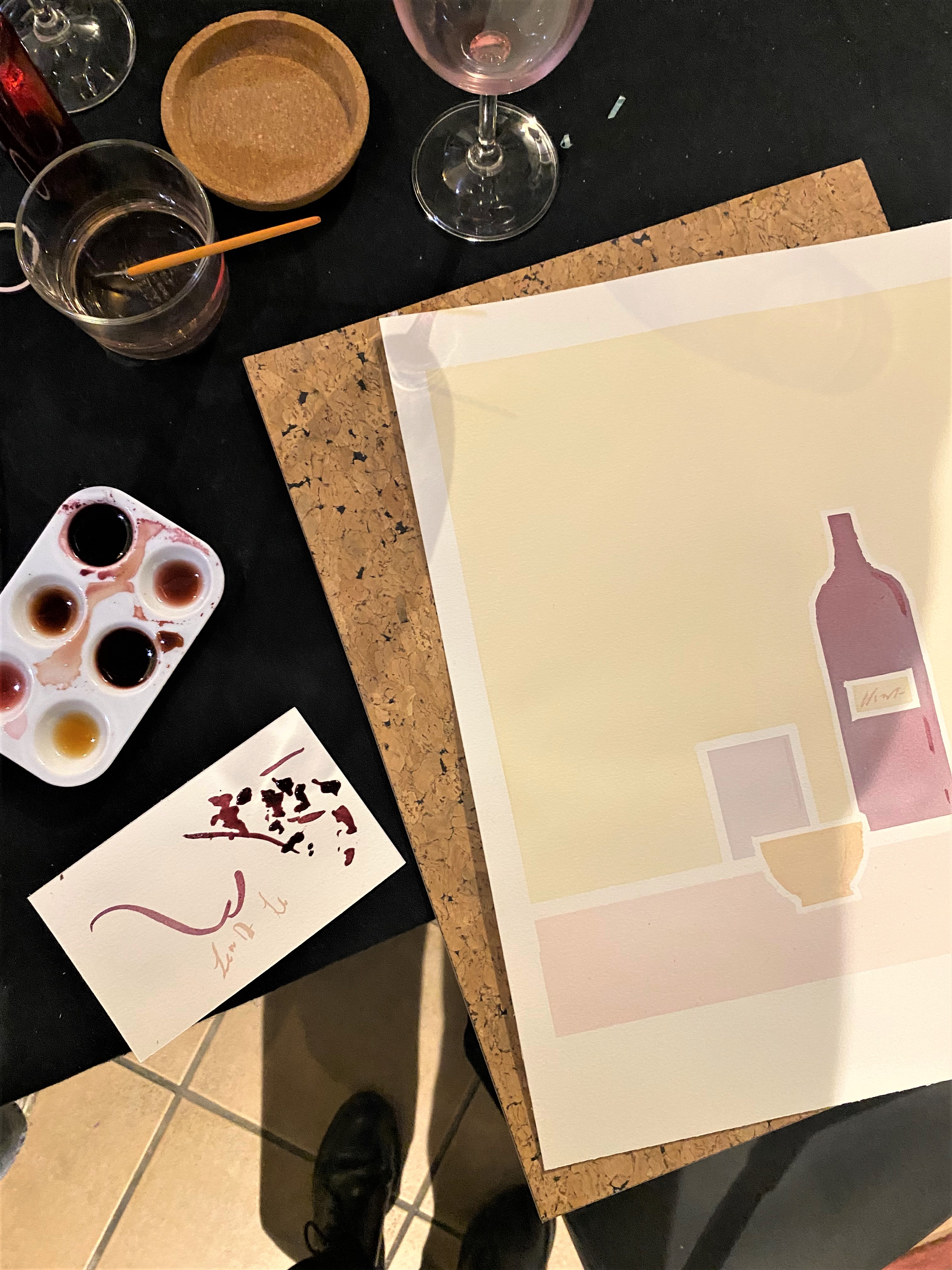 Devant nous, des papiers canson 30x40cm et des pinceaux de toutes les tailles. Chacun prend le temps de réfléchir à une idée, les premières esquisses jaillissent… Puis on se lance. On plonge notre pinceau dans l’une des six couleurs préparées par Sabrina, qu’elle vient de disposer à côté de nous. Il s’agit de différentes teintes de mauve, rose, bordeaux et beige, obtenues parfois grâce à la réduction de vin rouge, de blanc et même de rosé.