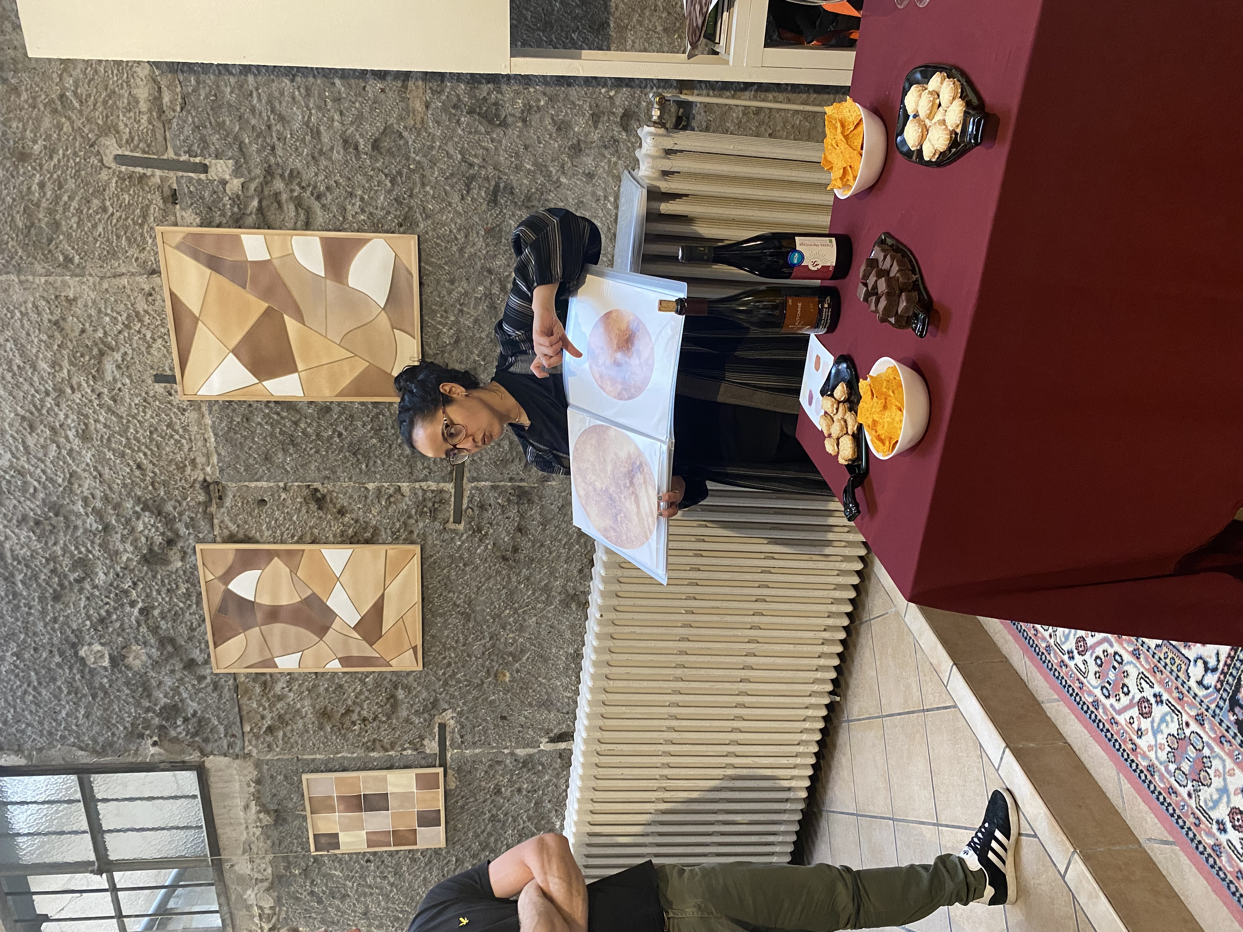 Sabrina est une artiste pleine d’idées. Il y a quelques années, la jeune femme s’est lancée dans la peinture au vin. Une pratique surprenante, mais qui fait sens. Avec du vin bouchonné, récupéré dans les bars et restaurants, où bien directement auprès des vignerons, Sabrina compose des œuvres. Parfois cosmiques, parfois abstraites, ses peintures ont la particularité d’évoluer dans le temps... C’est un peu de la magie. Mais revenons au début de l’atelier.