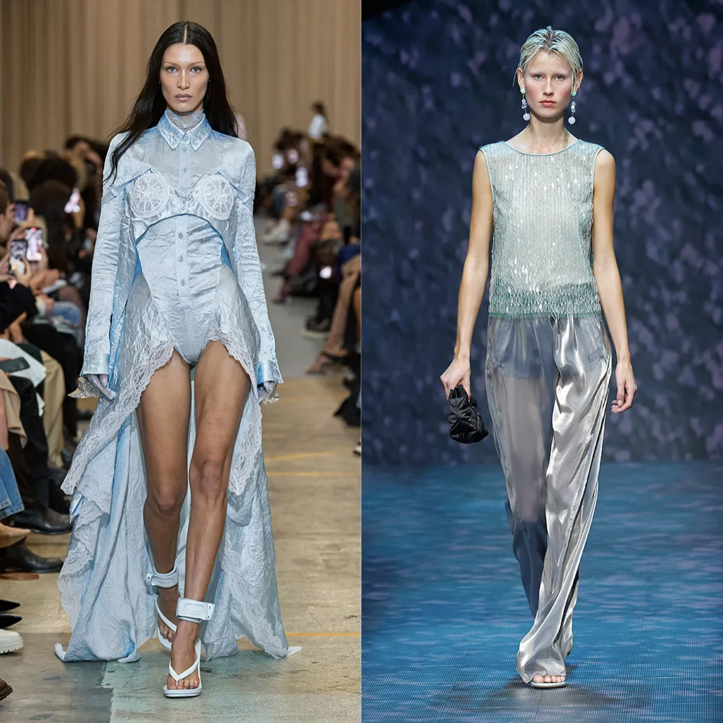 Après le rose intense et le rose Barbie, le bleu layette prend place dans nos dressings. Une envie de douceur pour l’été, qui teinte un vestiaire fluide et innocent comme chez Prada ou encore chez Burberry.