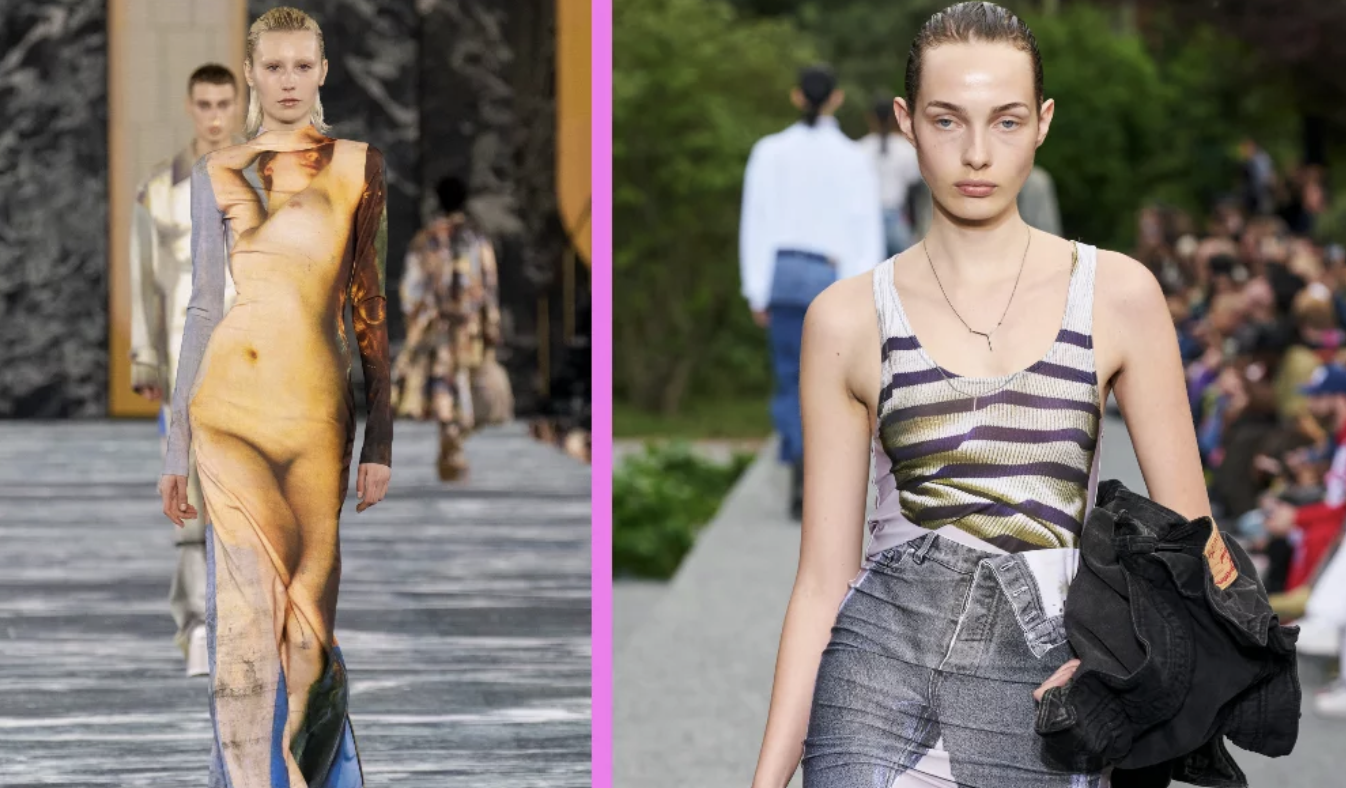 Concernant les imprimés, le trompe l’œil fait son apparition. T-shirt pixelisé, silhouette nue, illusion de jupe… Les marques s’en amusent et on adore ça ! Le trompe l’œil est la touche arty à adopter pour sortir des imprimés classiques saisonniers. Une touche signée Jean-paul Gautier, Loewe ou encore Balmain.