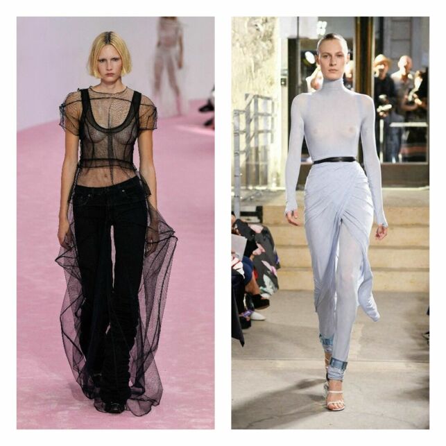 Après le succès de la naked dresse l’année dernière, la transparence s’empare de la case intégralité des silhouettes nocturnes sur les podiums. Mousseline, tulle, dentelle… le tissus dévoile subtilement vos courbes. Cette tendance peut être jouée de plusieurs manières : de jolis dessous neutres, une mini robe, ou un pantalon sous un fourreau transparent… Effet garanti ! À retrouver notamment chez Acné Studio, Chanel ou Alaïa.