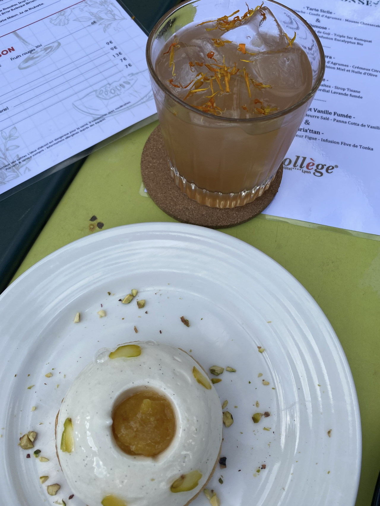 Il est 19h, l’air est doux, le soleil est caché par l’immense façade du sublime Collège Hôtel, où je n’avais d’ailleurs jamais été. C’est en mariant design et nostalgie que cet établissement revisite le thème de l’école dans une ambiance « back to school ». Il est situé à l’angle de la place Saint-Paul, dans le 5e arrondissement, au coeur de la ville. On nous indique la terrasse du 2ème étage comme point de chute. Les portes de l’ascenseur s’ouvrent. Etonnés, nous découvrons cette belle terrasse verdoyante et boisée. Nous sommes tous assis en cercle autour d’une table. Le chef Marvin Brandao et son acolyte Victor Weber nous présentent une carte composée de 3 accords parfaits entre pâtisseries et cocktails.