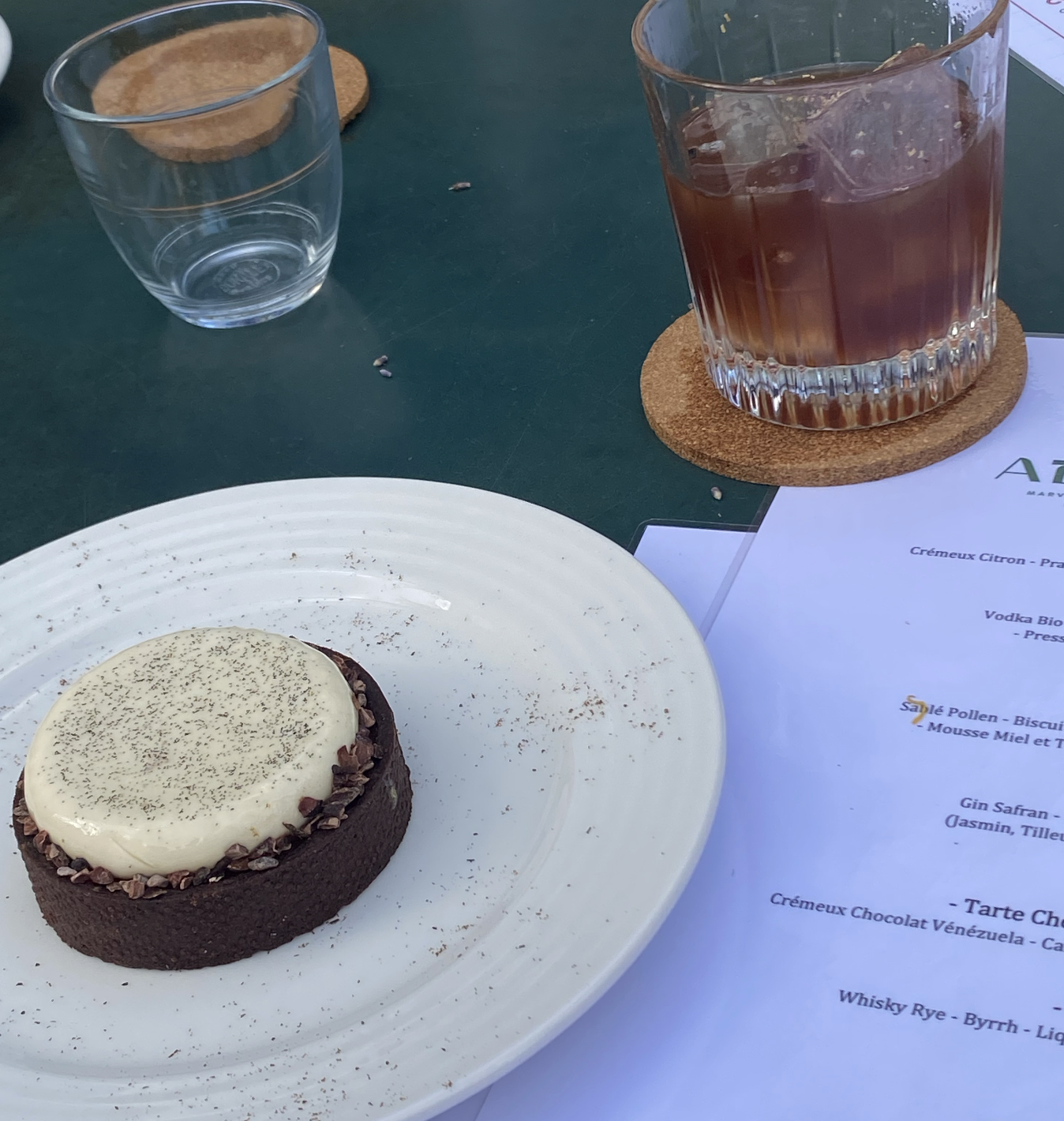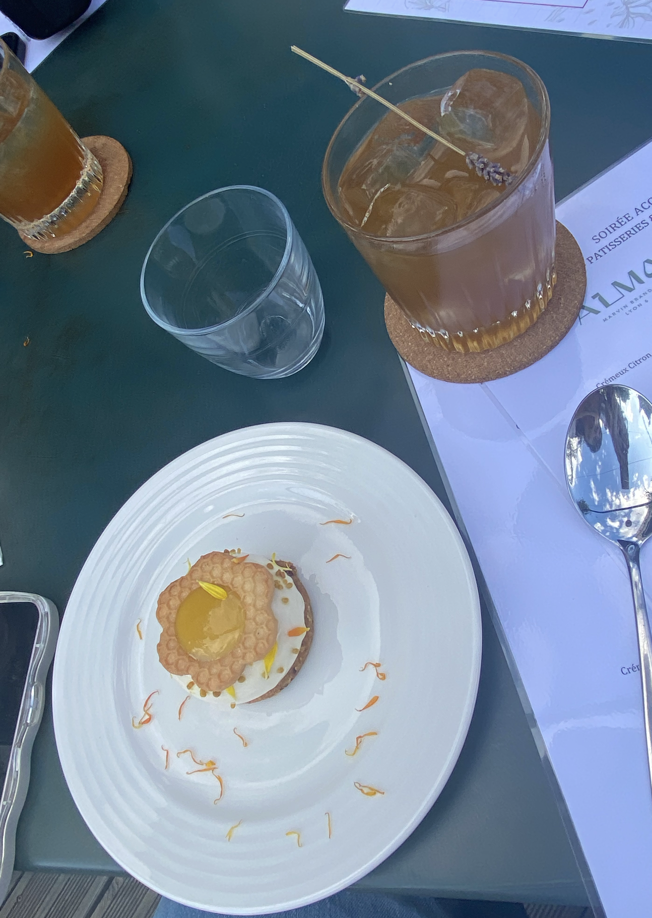 La première dégustation débute avec la tarte Sicile : crémeux de citron, un coeur praliné pistache, confit d’agrumes et mousse cheesecake à la vanille, accompagnée d’un cocktail (mon préféré !) À base de vodka bio et quinoa, d’une liqueur de Goji, d’un triple sec Kumquat, un jus de pomelo Corse pressé et une infusion d’Eucalyptus bio. Un parfait équilibre entre l’amertume de la vodka et l’acidité du citron. Et forcément, étant une grande adepte de tarte citron, je n’ai pu qu’apprécier !