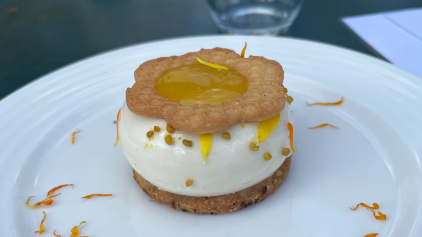 On enchaine ensuite sur un mélange un peu plus osé, celui du miel et de la lavande. Le chef nous sert sa création Apis Mellifera, une pâte sablée sur laquelle est dressée une mousse de miel et thym sauvage, un crémeux citron et une émulsion au miel et à l’huile d’olive (oui, moi aussi j’ai relu une seconde la carte). Cette composition était ornée d’un biscuit en forme de fleur citron et miel, et d’un confit d’agrumes. Côté cocktail, c’est un Burlesque qui est servi : gin safran, muscat de Rivesaltes, sirop de tisane et cordial lavande fumée. Des saveurs beaucoup plus marquées et intenses en bouche que le premier accord qui, lui, était beaucoup plus doux. On se rapproche petit à petit du dernier mélange et croyez-moi, celui vaut le détour !
