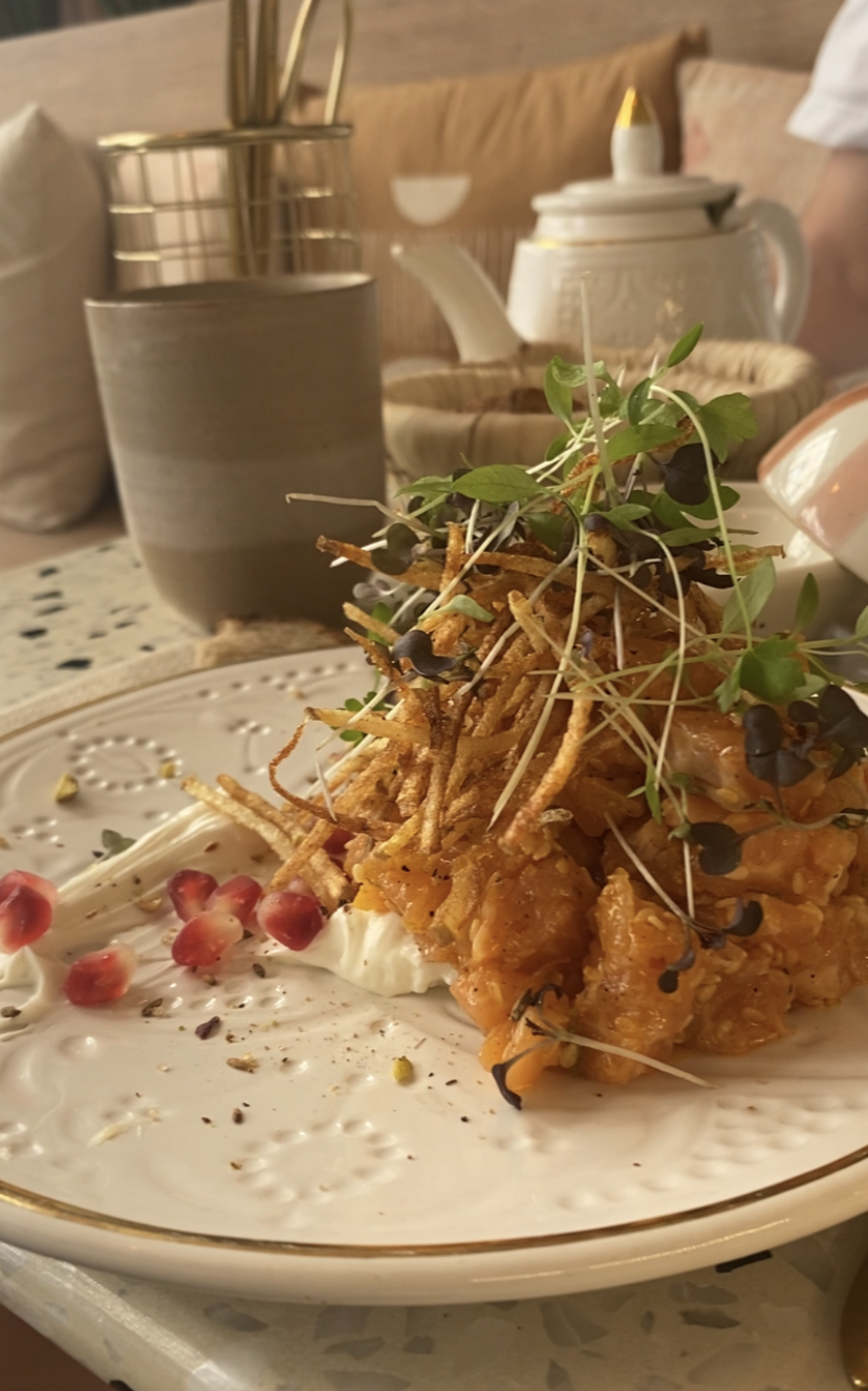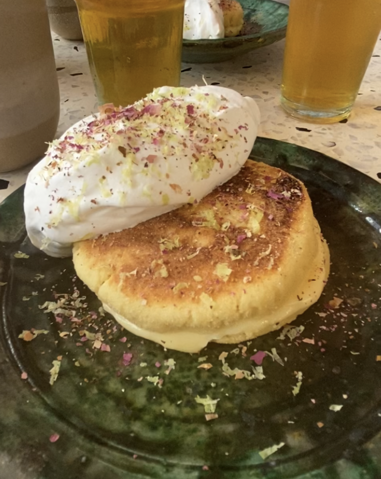 En guise de boisson chaude je choisis un thé à la menthe, accompagné d’un thé glacé à la fleur d’oranger pour me rafraichir. L’entrée est rapidement servie : Harcha, lemon curd et crème fouettée. Deux galettes de semoule marocaine garnies d’une délicieuse crème citron, sur lesquelles est délicatement déposée un savoureuse crème fouettée. Un doux mélange de saveurs parfait pour nous ouvrir l’appétit avec une belle note sucrée.