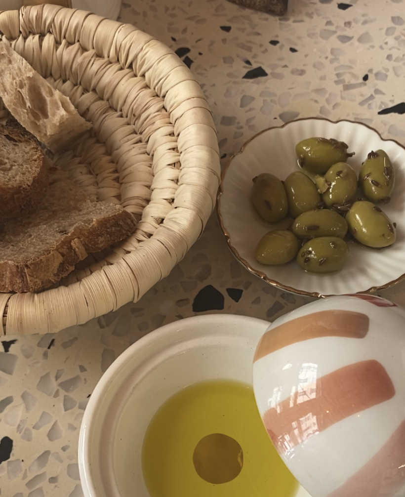 Dans l’attente du plat, on nous apporte quelques tranches de pain à tremper dans de l’huile d’olive accompagnées d’olives marinées, pour patienter. Puis, place au plat de résistance, un tartare de saumon, harissa, citron confit et pomme paille. Une portion généreuse et relevée, qui nous transporte de l’autre côté de la Méditerranée.