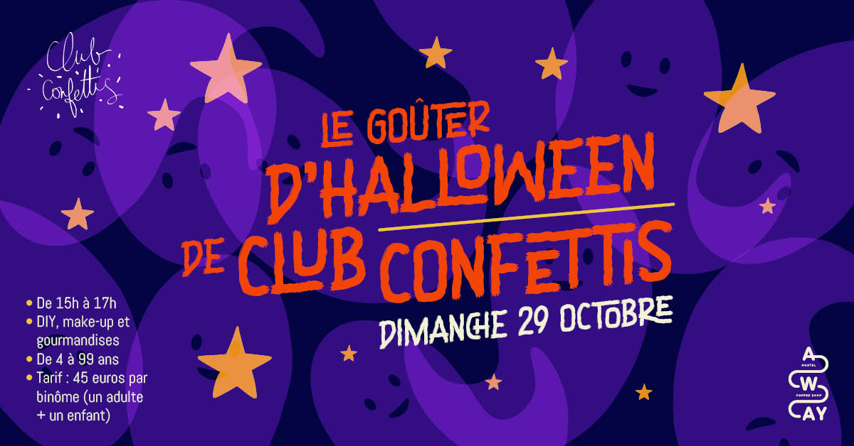 Violette de Club Confettis et toute l'équipe de l'auberge de jeunesse Away, vous invite ce dimanche 29 octobre à venir partager un super goûter festif d'Halloween en binôme adulte-enfant (dès 4 ans). Customisation du mini sac à bonbon, photobooth et création de cadre photo, goûter gourmand et maquillage à paillettes pour petits et grands. Sur réservation.