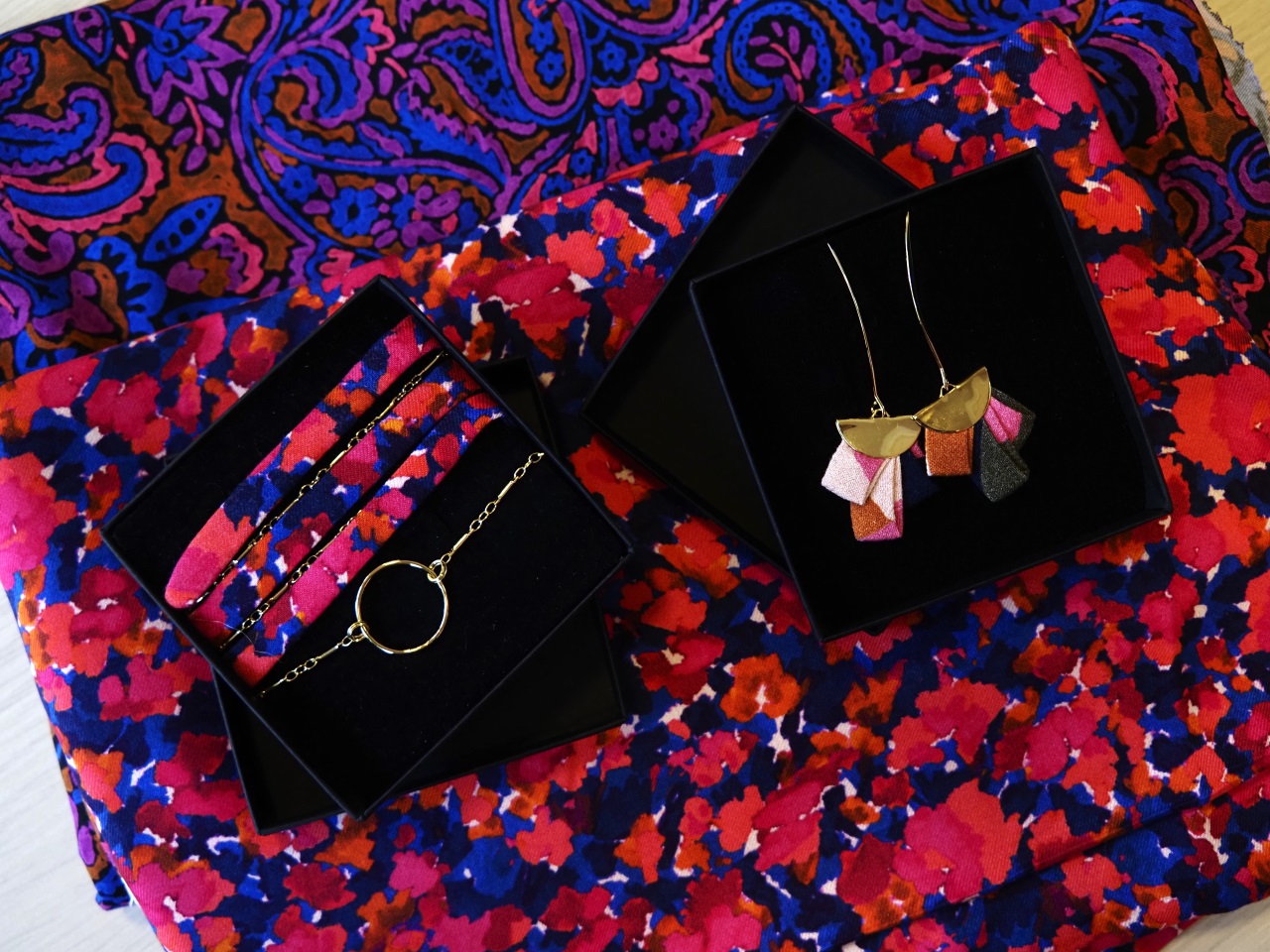 Sur son site, vous retrouverez donc divers tissus au mètre imprimés dans le Rhône, du léopard (mais de bon goût) à un magnifique jacquard vert bouteille, en passant par des fleurs et de l’Ikat (un motif strié qui marque le tissage), mais aussi des box coutures made in Rhône-Alpes à personnaliser, et des bijoux réalisés en collaboration avec l’orangerie, assortis aux tissus proposés sur le site. Le but : assortir votre création vestimentaire, avec un jonc, boucles d’oreilles, ou bracelet trois rangs (convertible en tour de tête !) au même design.