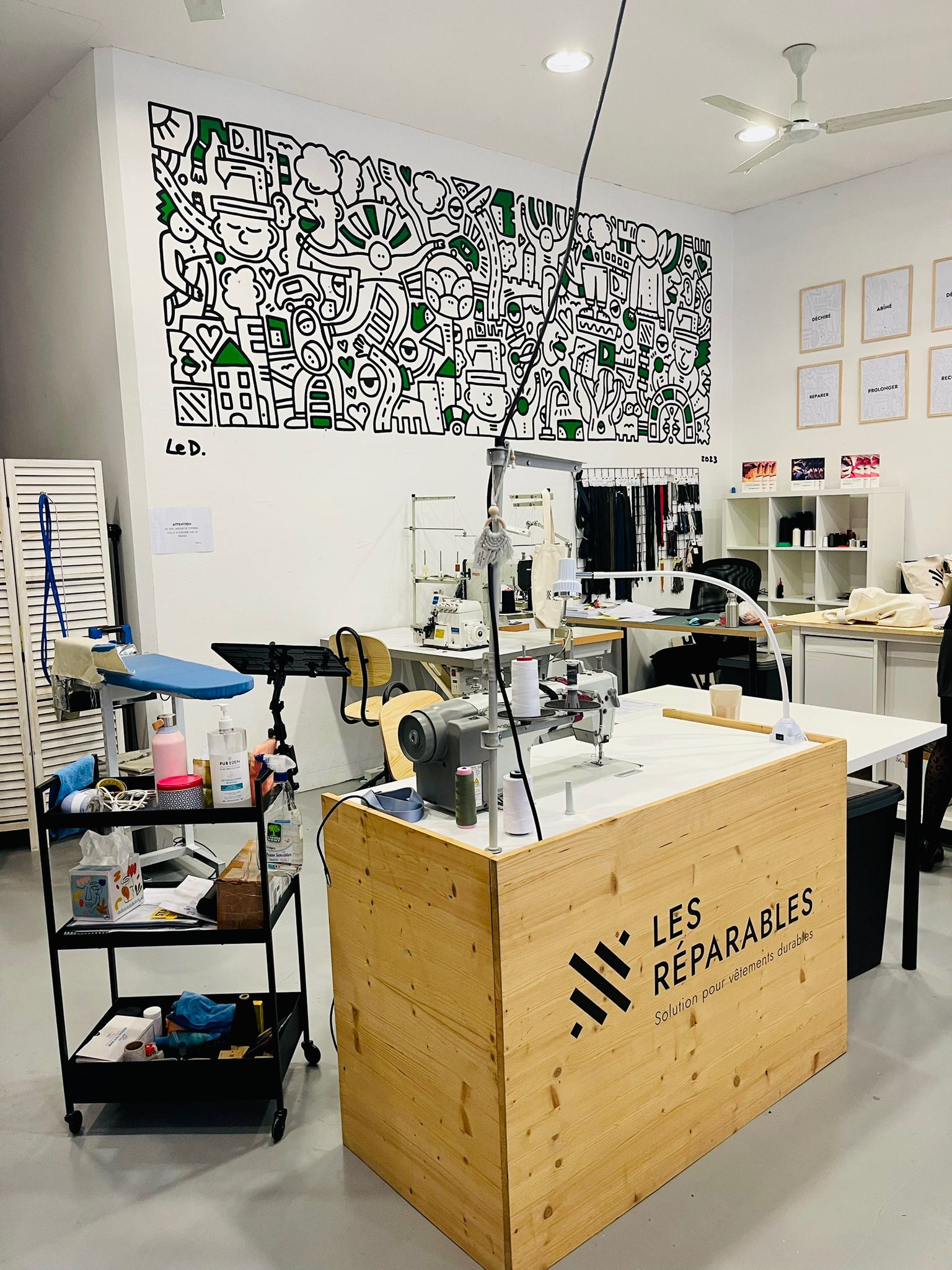 Puis, dans l’atelier principal, où une grande fresque surplombe les ateliers des deux autres artisans permanents, la magie continue : Les Réparables et Mode Estime refont le monde à leur façon. Le premier réparera sans soucis vos vêtements favori, le plus discrètement et efficacement possible, via leur site internet. Pas de customisation ou d’upcycling, ici on répare le plus discrètement possible pour ne pas dénaturer la pièce. Avec la nouvelle réforme pour la réparation, vous pouvez même obtenir une réduction, qui sera compensée à l’artisan par l’Etat.