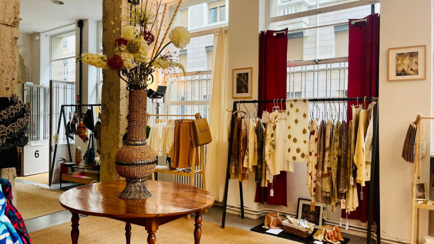 L’œil est immédiatement attiré par les tissus colorés de My Dress Made, mais aussi par les pétillantes bananes en tissus recyclés de Joyeux Bordel, suspendues aux quatre coins de l’atelier. Mais on retrouve également les vêtements pour enfants de Bazélie (craquants), les pièces vintages customisées par des "artistes du fripier" Moitié-Moitié, et finalement les délicats bijoux des Ateliers Kaamos, entre dentelle et tissu.