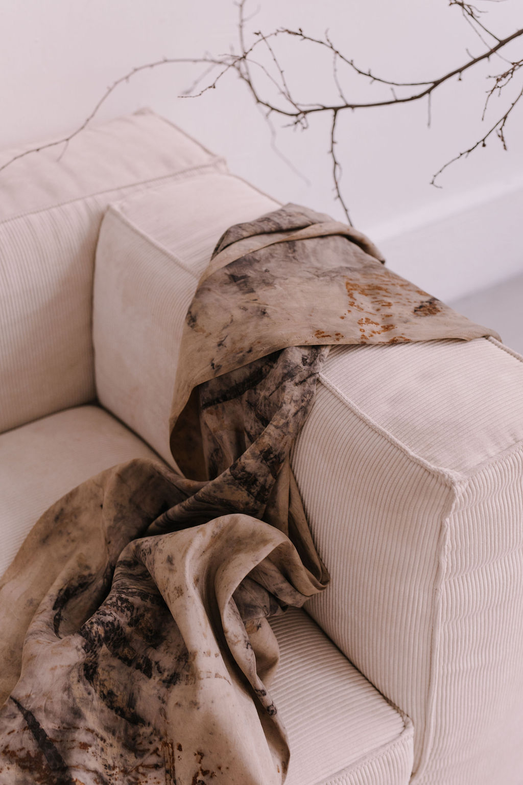 La jeune femme imagine des pièces textiles ou bien destinées à la décoration murale réalisées à base de teintures naturelles sur mesure qu’elle obtient à partir de plantes et de pigments naturels qu’elle prend soin de sélectionner. "Ce que j’aime avec la teinture végétale, c’est qu’elle offre une infinité de possibilités, je ne m’ennuie jamais, c’est vraiment ce que j’aime dans cette technique". Un réel savoir-faire qui demande une connaissance profonde de la plante. Il est ensuite possible de se servir de ces teintures à travers de nombreuses techniques, notamment celle de l’éco-print, qui consiste à envelopper les fleurs et les plantes dans de la soie. Celles-ci sont ensuite chauffées à la vapeur, donnant ainsi naissance à des couleurs subtiles et à de somptueux motifs. L’une des caractéristiques principales de la teinture végétale, c’est que celle-ci évolue au fil du temps, en changeant de couleur ou bien en s’atténuant.