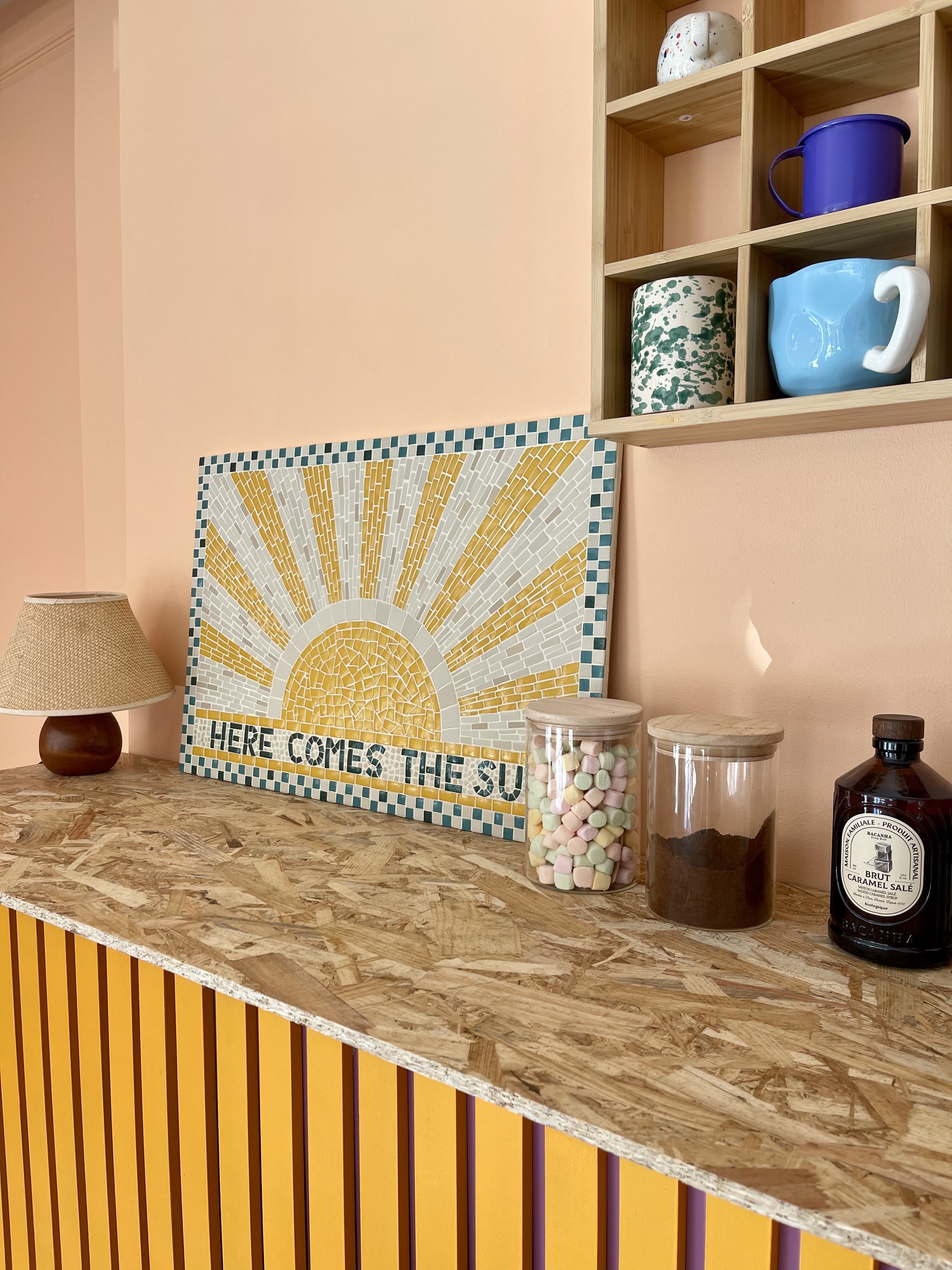 Particuliers comme professionnels, notamment des décorateurs et des architectes d’intérieur, la sollicitent pour des enseignes, des pas de porte, des façades, des tableaux, des contremarches d’escaliers ou encore des frises dans la cuisine, la salle de bain ou encore dans une piscine. "Les particuliers vont beaucoup plus me donner carte blanche. Je vais donc m’imprégner des lieux et de la décoration de base. Je crée une proposition graphique qui va être unique. On va ensuite se mettre d’accord pour harmoniser les couleurs et les matières. Je réalise dans mon atelier le projet à l’envers sur du papier kraft avant de venir chez le client pour mettre le travail à l’endroit et le coller directement chez lui", explique Marion Achache.