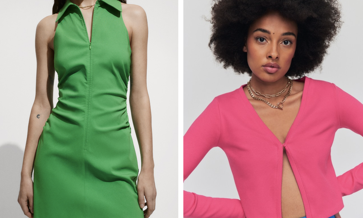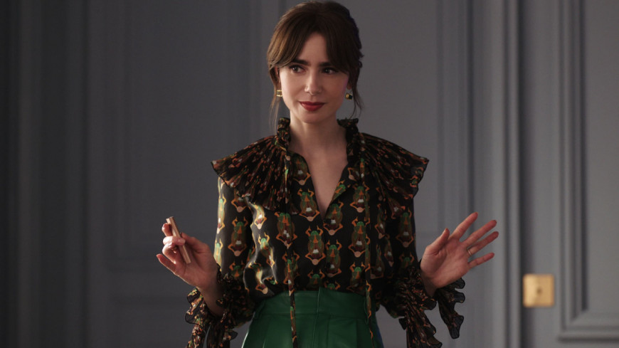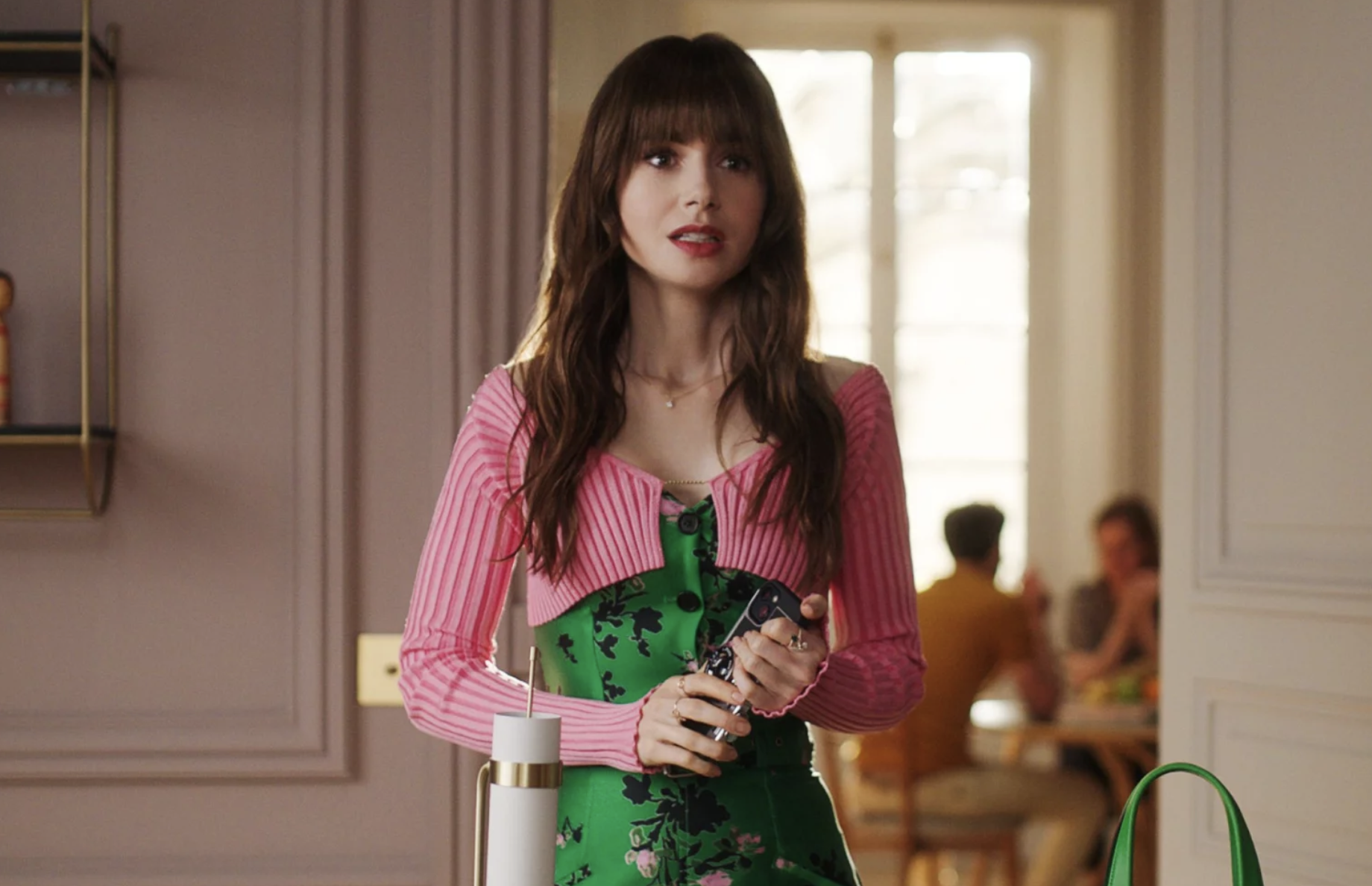 Dès le premier épisode, Emily mêle avec brio imprimé japonisant et détails modernes avec un cardigan rose Jacquemus et un ensemble short et haut vert, signé Philosophy. Chez Mango, vous pourrez opter pour une robe chemisier d’un vert éclatant, associée à un petit gilet rose de la marque BZB.