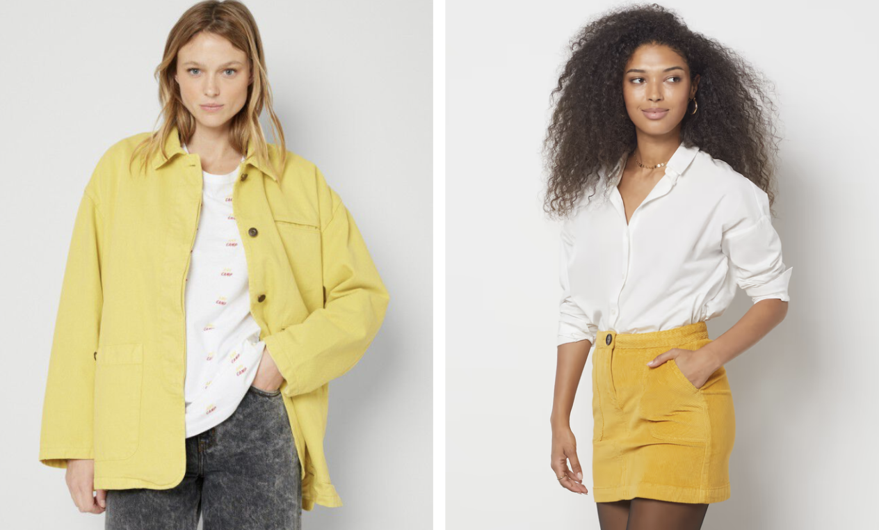 Une silhouette jaune, parfaitement exécutée, encore un sans faute pour Emily qui nous dévoile une jupe Isabel Marant ainsi qu’une large veste en cuir de la maison parisienne Possery. Pour la jupe en velours, vous pourrez vous tourner vers Etam avec un modèle plutôt efficace. Du côté de la veste, American Vintage propose sa pièce phare : Datcity.