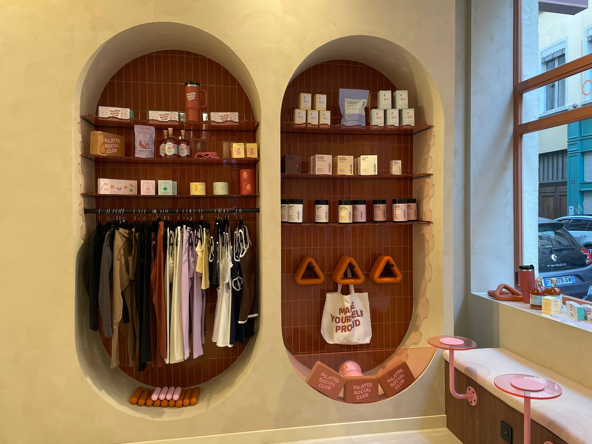 Sur place, on découvre une décoration minutieusement pensée, avec la possibilité de prendre un café, de se poser, ou même d’acheter une de leurs tenues "aesthetic" pour se sentir stylé pendant le cours de Pilates. La visite continue avec les vestiaires, ornés de carreaux roses et baignés d’une douce odeur.