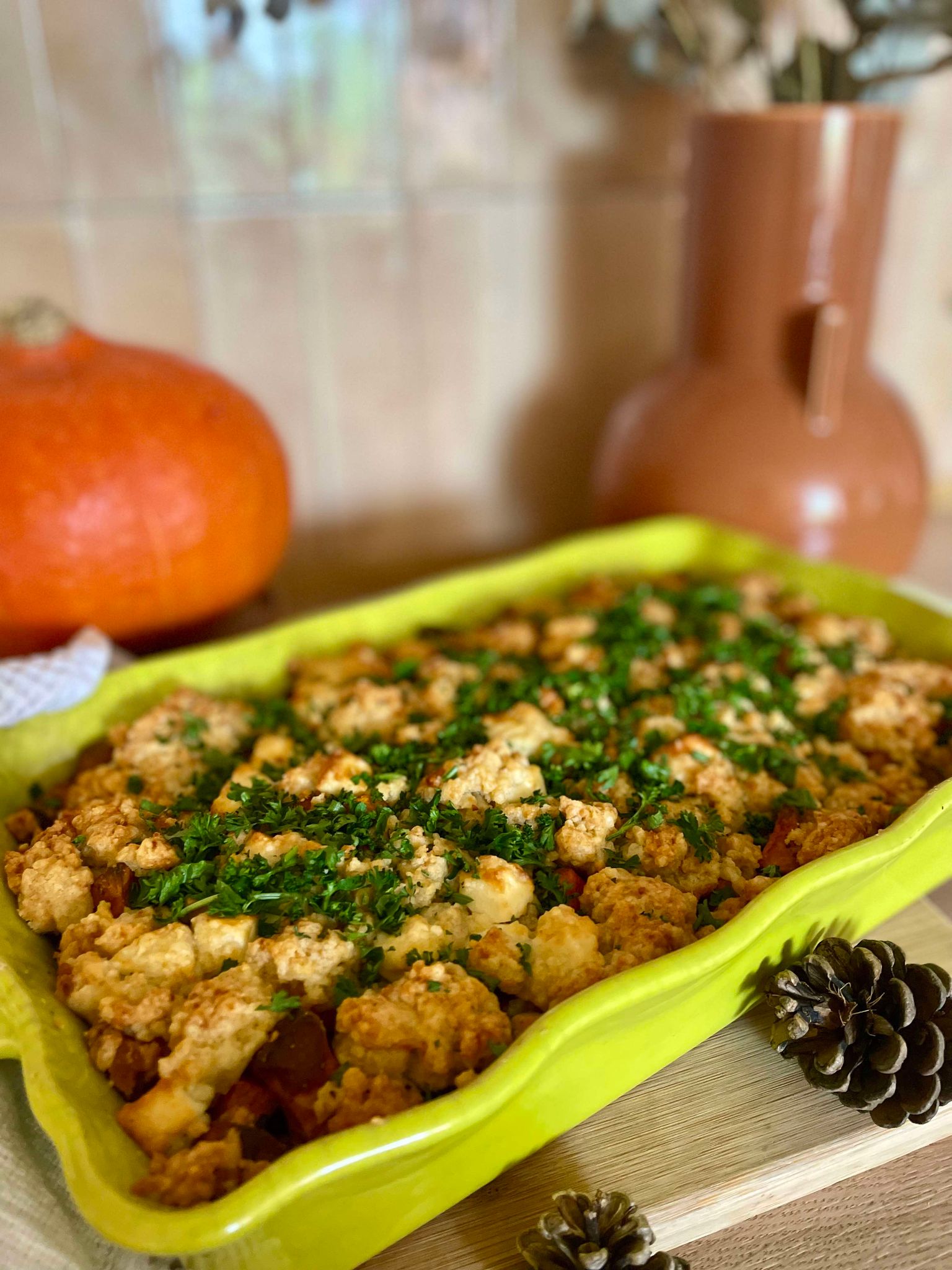 - Une fois la cuisson de vos légumes terminée, recouvrez-les de votre « crumble », et enfournez de nouveau le plat au four pendant 15 min à 200*C.