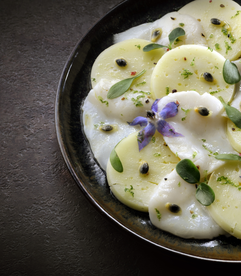 Carpaccio de St-Jacques, Fromage Abondance et Fruit de la passion.