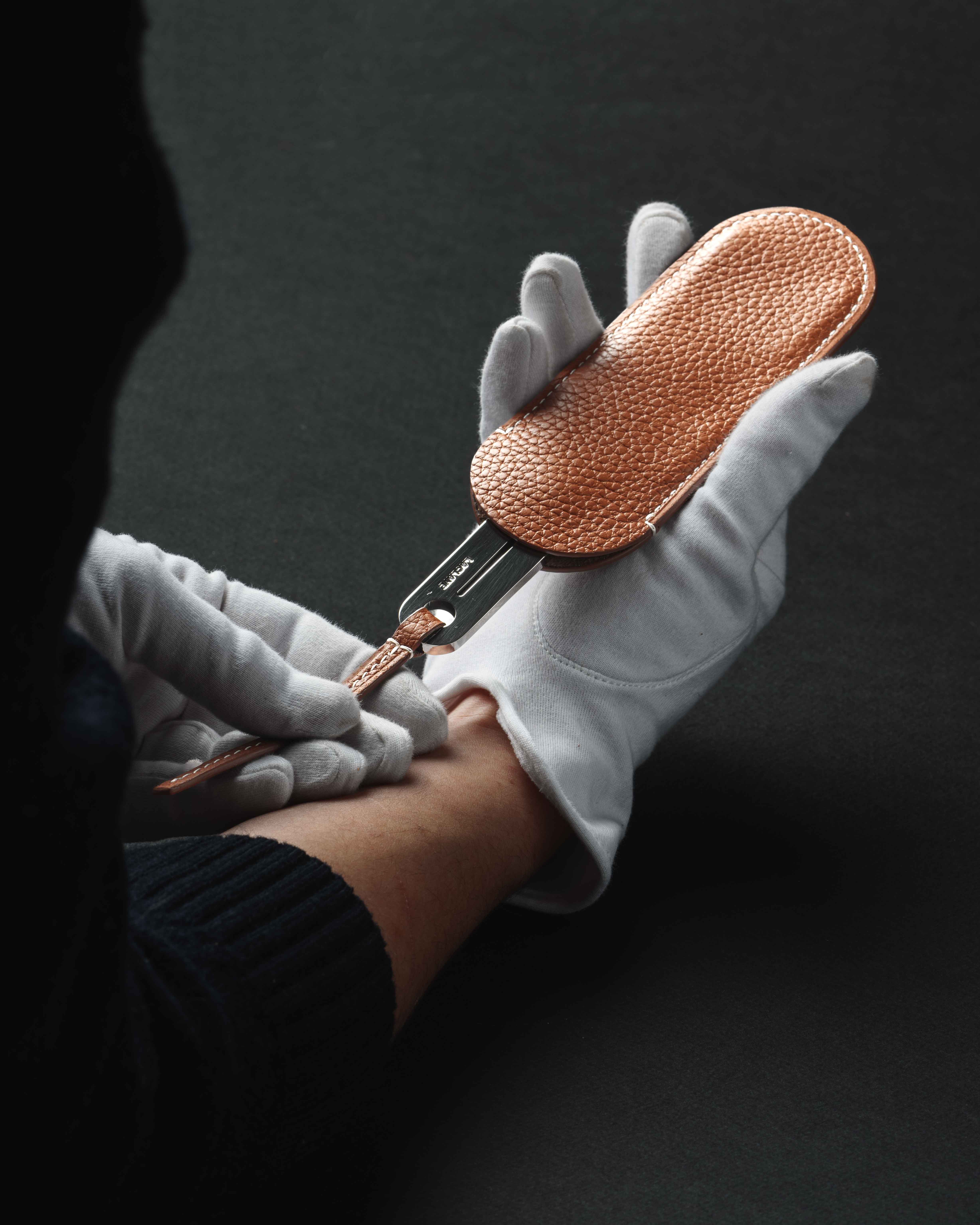 Anne-Sophie : On s’est dit mais c’est génial, ce n’est pas possible, il faut que le monde connaisse cet objet ! (Rires). On est passionné d’artisanat, de belles choses. Ça ouvre le champagne, les belles bouteilles, il faut que ce soit un bel objet. On voulait faire travailler des artisans, en rajoutant du cuir. (Certains modèles disposent d’un petit étui en cuir).