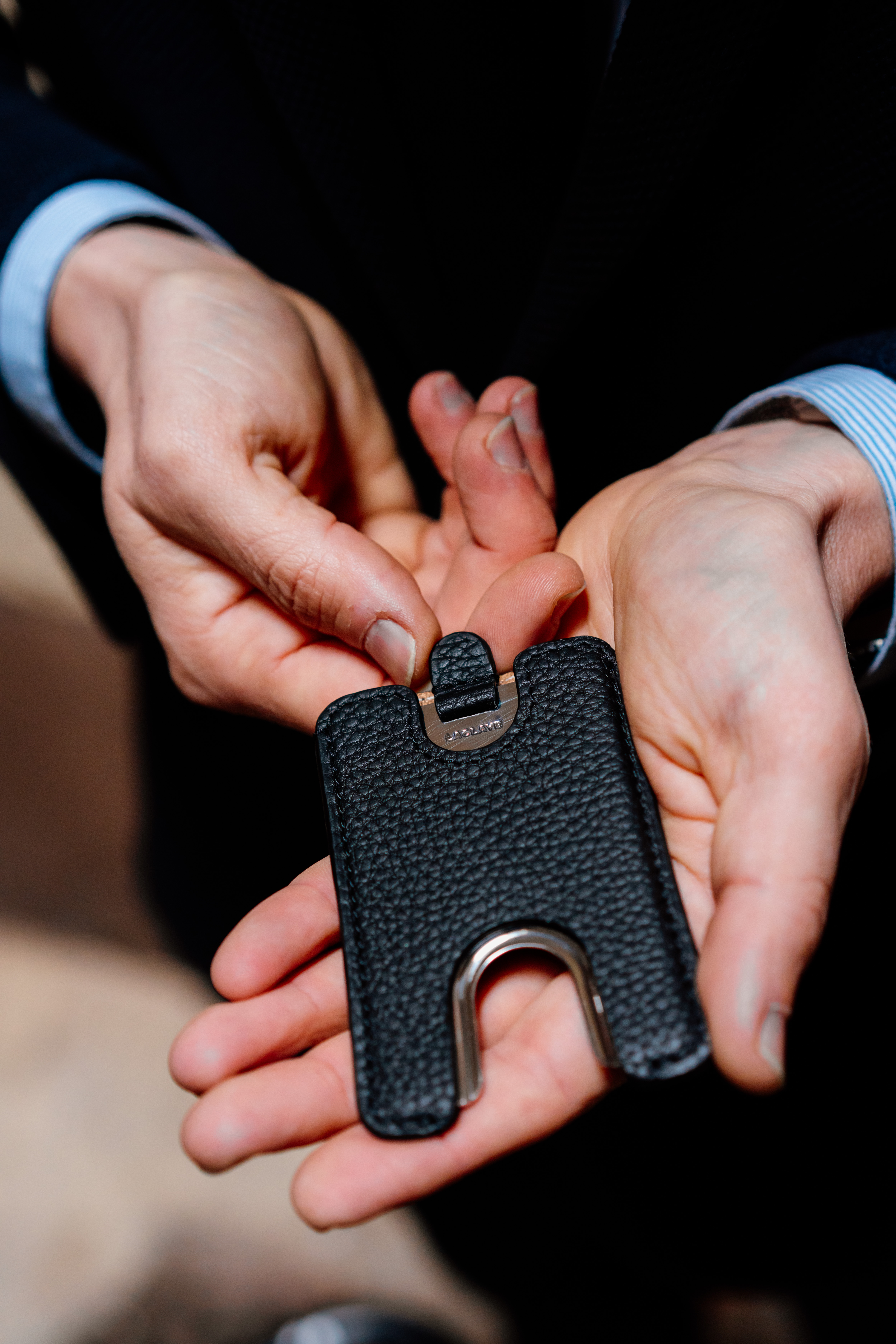 Anne-Sophie : On a le format carte, qui s’appelle La Card. Selon les couleurs, on va de 50 euros à 90 euros. Ensuite, on a deux modèles iconiques et emblématiques où l’on retrouve du cuir. La Classy et La Classique avec du poli miroir 1938. (Date à laquelle remonterait le premier objet avec cette fonctionnalité).