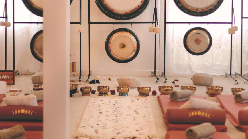 Il n’est pas encore 18 heures. Direction l’ancienne gare des Brotteaux dans le 6e arrondissement pour franchir la porte de Feel Gong, premier centre de sonothérapie de Lyon. Il faut d’abord montrer patte blanche ou plutôt enlever ses chaussures avant de rejoindre le vestiaire au sous-sol pour se mettre à l’aise. Le sac et le manteau dans le casier, place à la séance de bain sonore dans une pièce à la moquette moelleuse inspirant déjà à la relaxation. Les lumières sont tamisées laissant presque place à ce qui ressemble à un ciel étoilé.